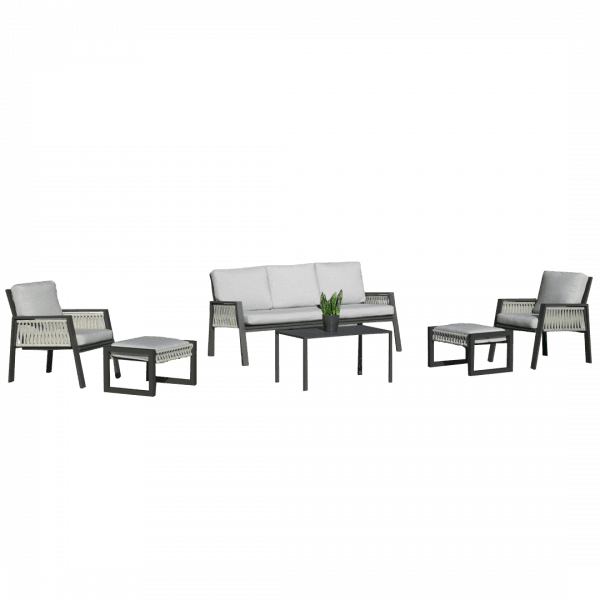The Aldara-8 Aluminium and Rope Set comprises an aluminium sofa, two armchairs, and a coffee table with a lightweight frame wrapped in hand-woven nautical rope and comfortable cushions for maximum outdoor comfort.