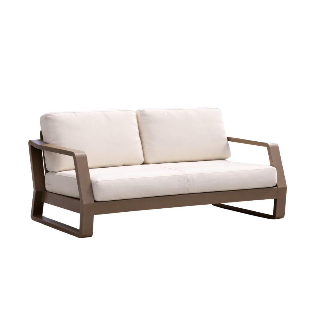 ARMANIA 2-seater outdoor sofa with a reinforced aluminium frame, crafted in Spain. A minimalist design with sleek lines offering exceptional comfort and total resistance to corrosion.