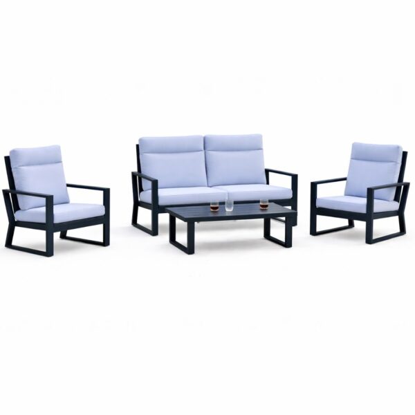 This sophisticated BOLONIA 7 XL outdoor set includes an extra-wide two-seater sofa, two armchairs, and a coffee table. Its Spanish-made aluminium frame guarantees lightness and total oxidation resistance, offering a modern and durable design for exclusive terraces.