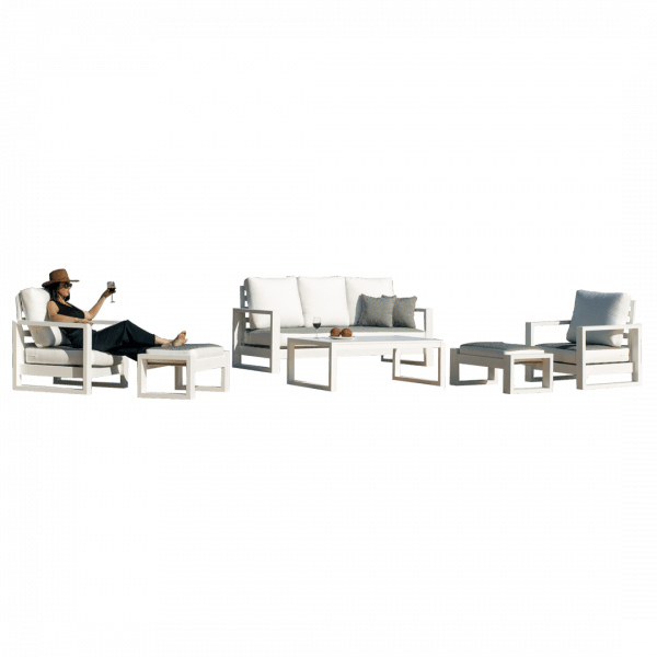 Large-format aluminium outdoor set featuring a 3-seater sofa, two armchairs and a coffee table, ideal for large gardens or terraces. Proudly manufactured in Spain with high-quality materials. The Cartago-8 set features removable and washable cushion covers.