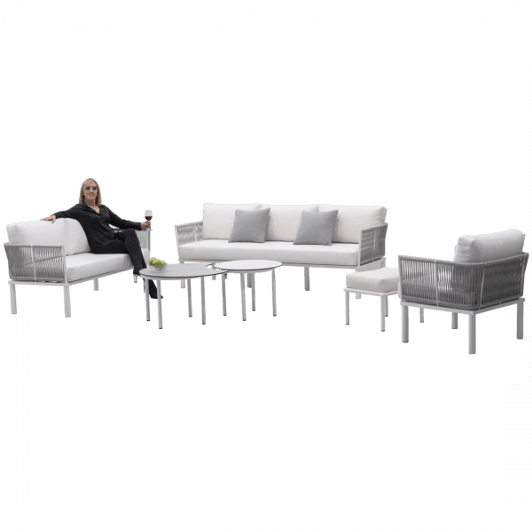 Garden set manufactured with a robust aluminium frame and high-quality braided rope for outdoor use. Includes sofas, armchair, side tables, and footstools, offering a complete and balanced configuration. Designed for residential and contract exteriors, it combines durability, comfort, and a contemporary aesthetic.