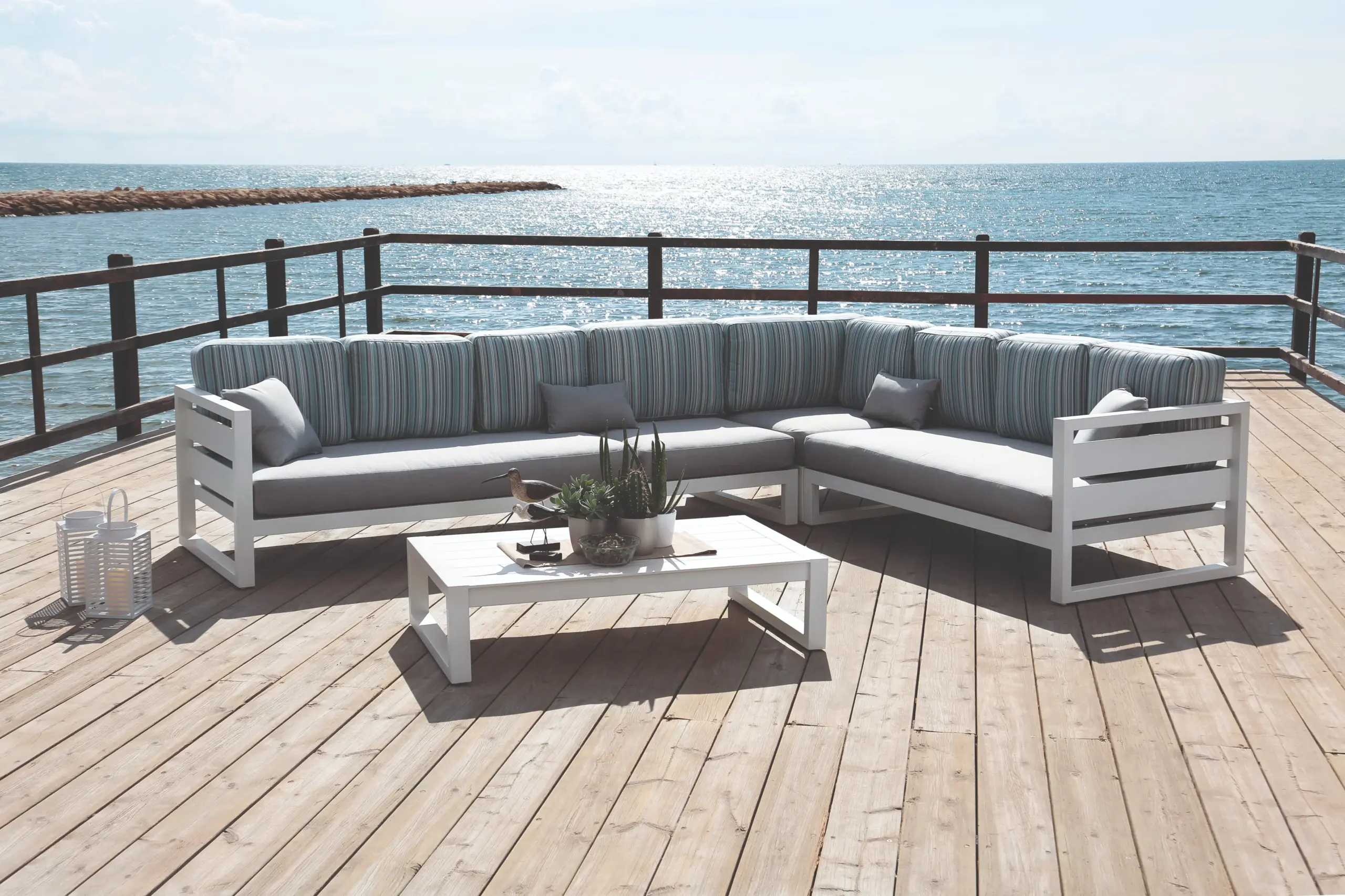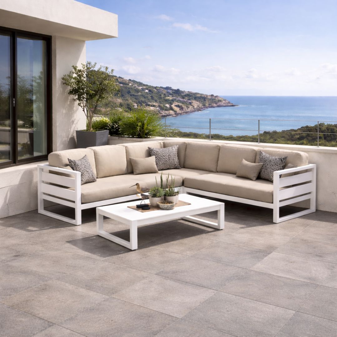 Corner set manufactured in high-resistance aluminium, comprising sofas, a corner module, and a coffee table. Designed for the outdoors, it offers large capacity and a stable structure, combining functionality, durability, and contemporary design.
