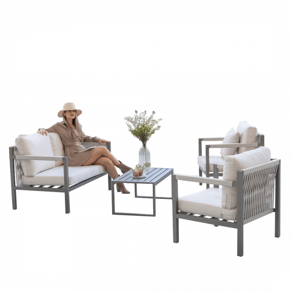 All our furniture undergoes a meticulous manufacturing process. We use Qualicoat paint to ensure a finish of the highest quality for every piece. Furthermore, each component is precision-cut and polished, allowing the paint to bond perfectly with the aluminium pores, guaranteeing superior resistance. Finally, the pieces are sealed in powder-coating ovens, ensuring a strong and durable layer. This set blends contemporary design with great functionality. Crafted with high-resistance rope, it brings an elegant and sophisticated touch to gardens or terraces. The 4-seater sofa, armchairs, and coffee table offer comfort and durability, creating a relaxing outdoor ambiance that is perfect for any exterior space.
