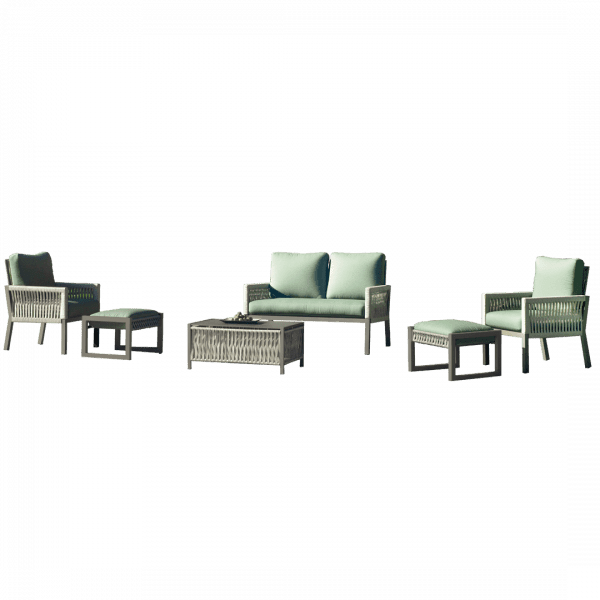 This Aluminium Garden Furniture Set stands out for its light and resistant structure, combined with an elegant nautical rope weave. It includes a two-seater sofa, two individual armchairs, and a coffee table with a tempered glass top, offering comfort and style in outdoor spaces.