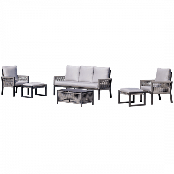This Aluminium Garden Furniture Set combines a light and resistant structure with an elegant nautical rope weave. Featuring a three-seater sofa, two armchairs, and a coffee table with tempered glass, it is ideal for outdoor spaces with style and comfort.
