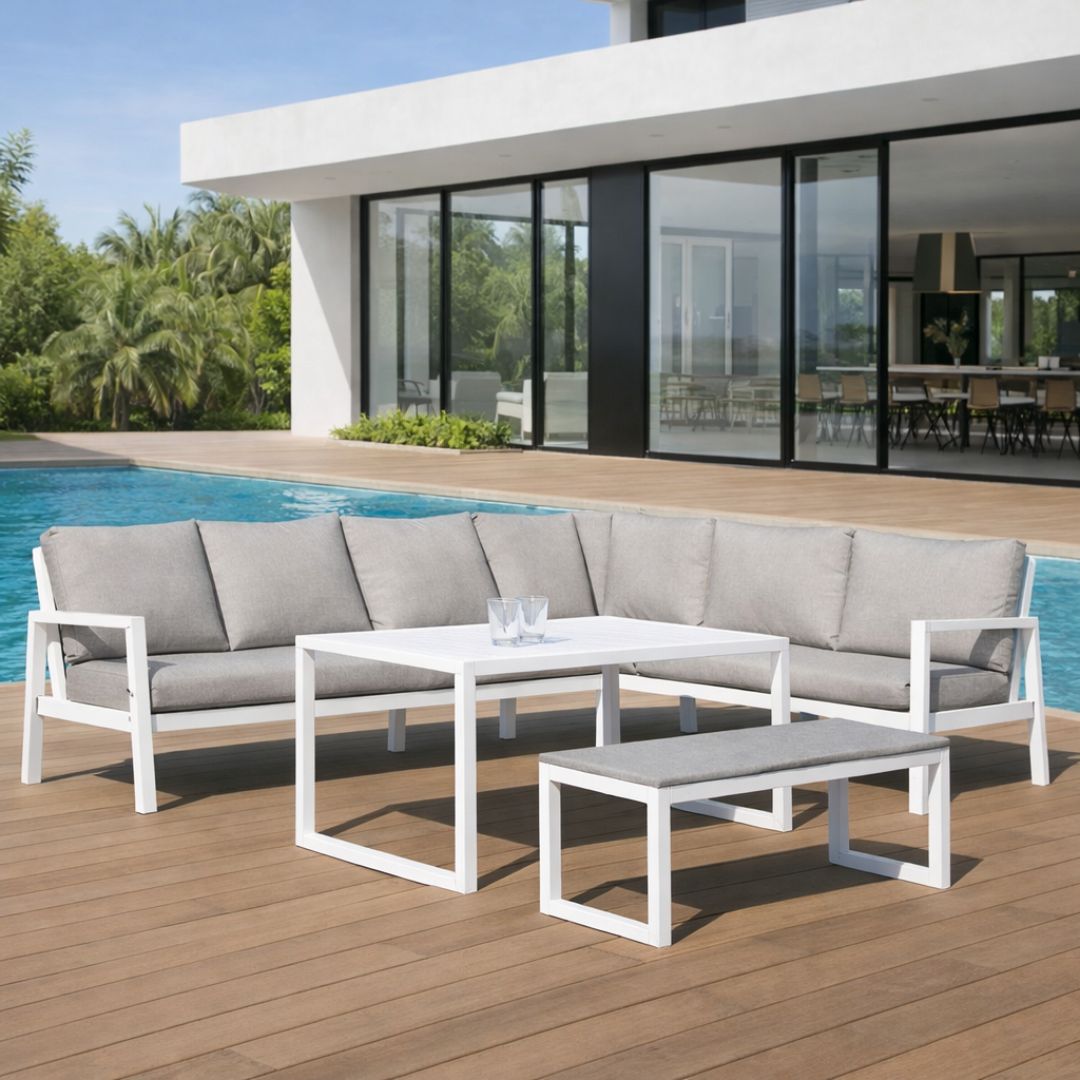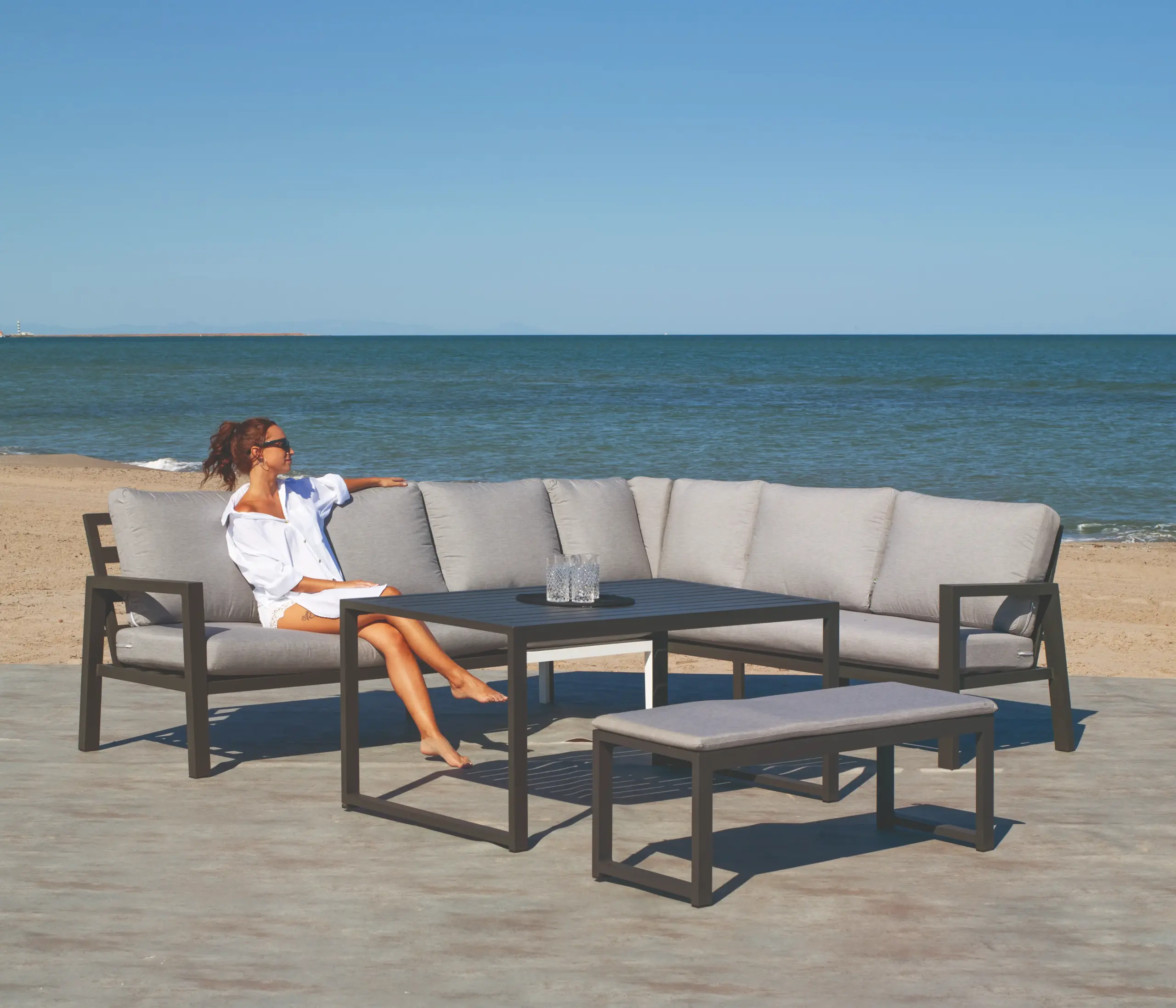 An aluminium corner set featuring a high table and auxiliary bench, designed to create a functional outdoor dining space. It includes sofas and complementary modules, offering durability, versatility, and a modern aesthetic tailored for the outdoors.