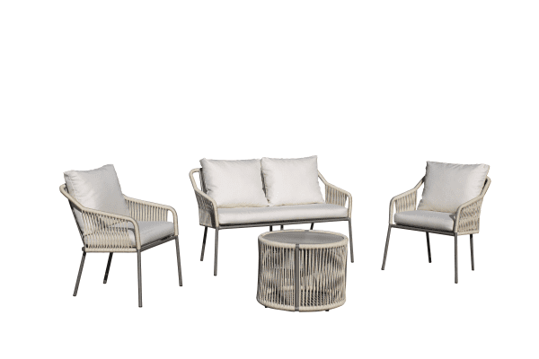 The Jasmyn-7 4-piece aluminium outdoor furniture set features customisable rope that does not fray or slacken and a table with a resistant HPL top. Ideal for terraces and gardens.