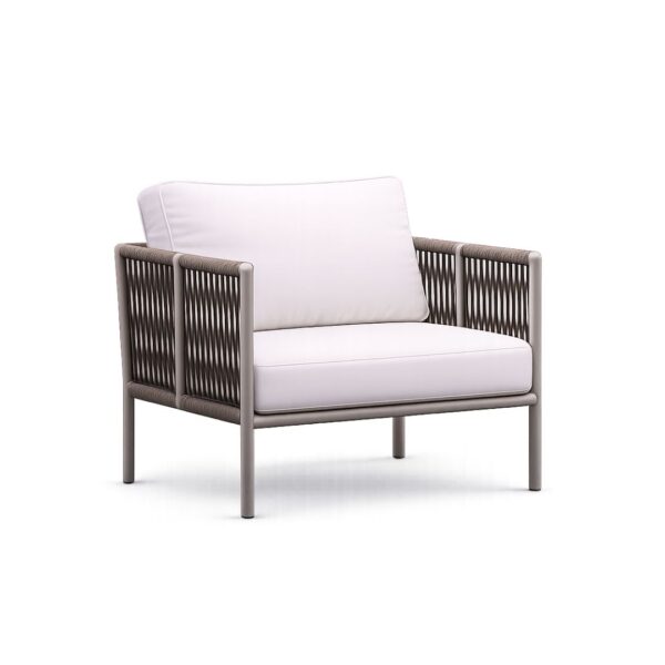 JAVA single-seater outdoor armchair featuring a reinforced aluminium frame and Spanish manufacture. Its minimalist and balanced design offers superior comfort, guaranteeing total corrosion resistance on modern terraces.