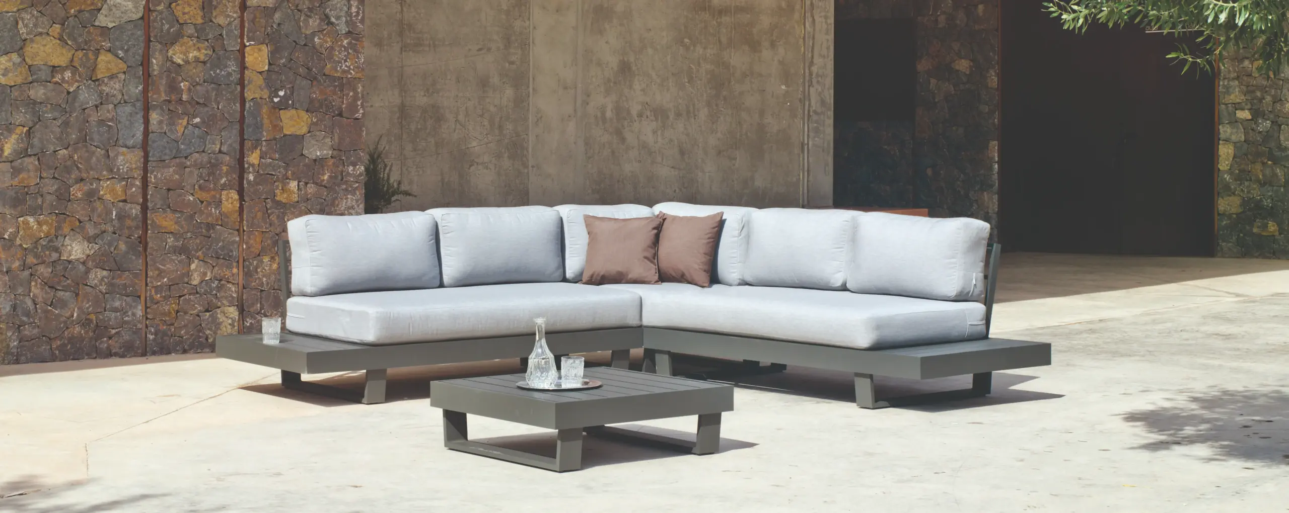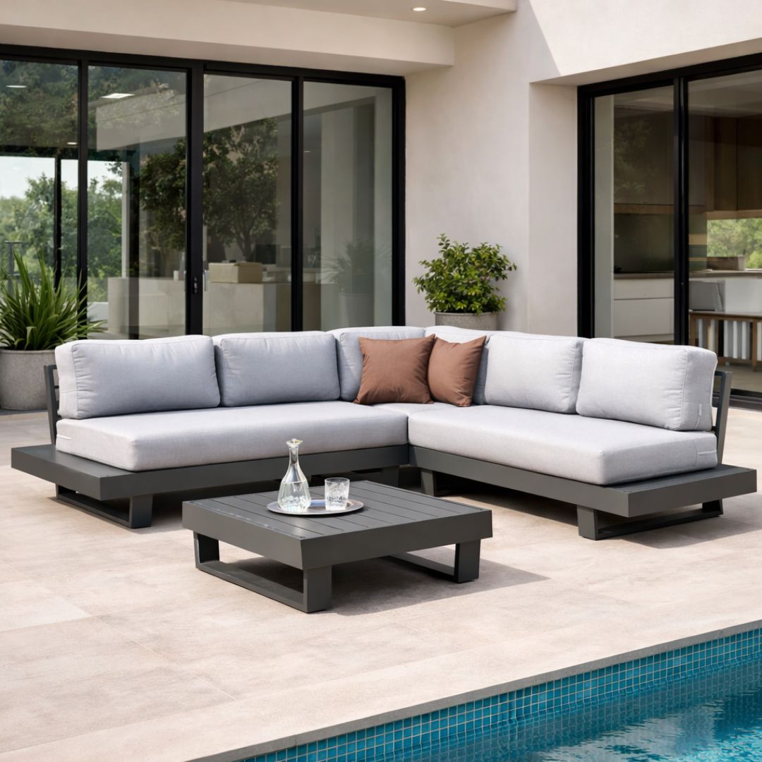 Compact corner set manufactured in aluminium, comprising modular sofas and a coffee table. Designed for porches and medium-sized terraces, it offers a functional and resistant solution that combines comfort, lightness, and a modern design.