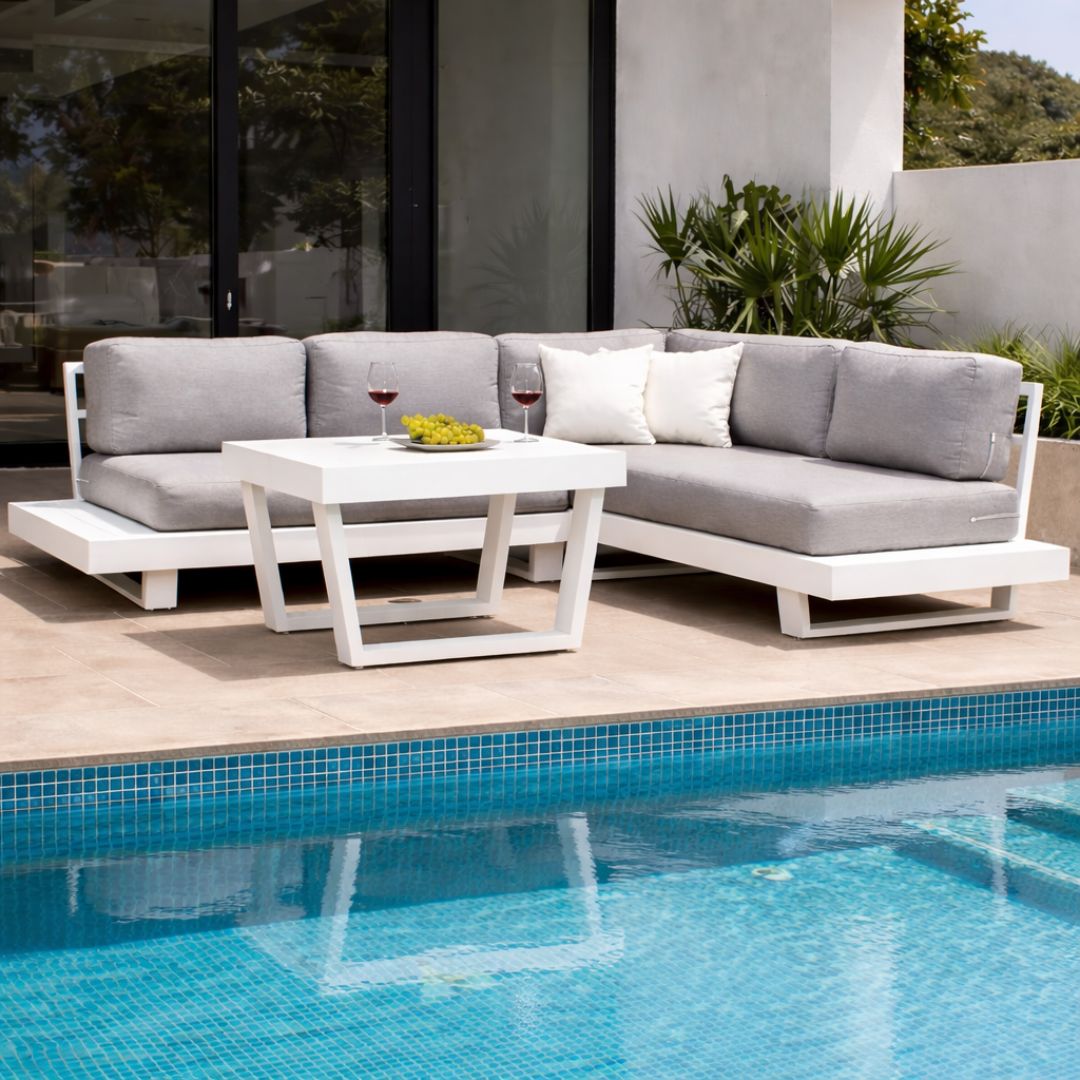 Menfis-8 Garden Corner Set, manufactured in Spain with modular sofas and a high dining table. Robust aluminium structure.