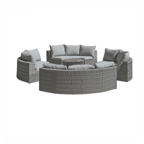 The Naroha round corner sofa is an outdoor set composed of four three-seater semi-circular sofas and a circular coffee table. Manufactured with an aluminium structure and upholstered in non-deformable braided rope, it features high-quality cushions that are easily removable and washable.