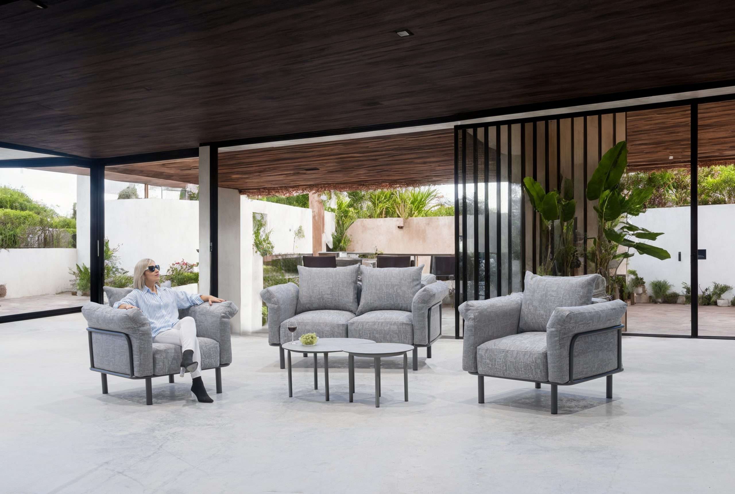 The Brandon-7 Sofa Set with XL Cushions is the perfect choice for those seeking comfort and style in their outdoor space. This set includes a two-seater sofa, individual armchairs and a coffee table, all manufactured with a durable and modern aluminium frame. What truly distinguishes this set are the XL cushions, providing an exceptional level of comfort, perfect for relaxing for hours outdoors.