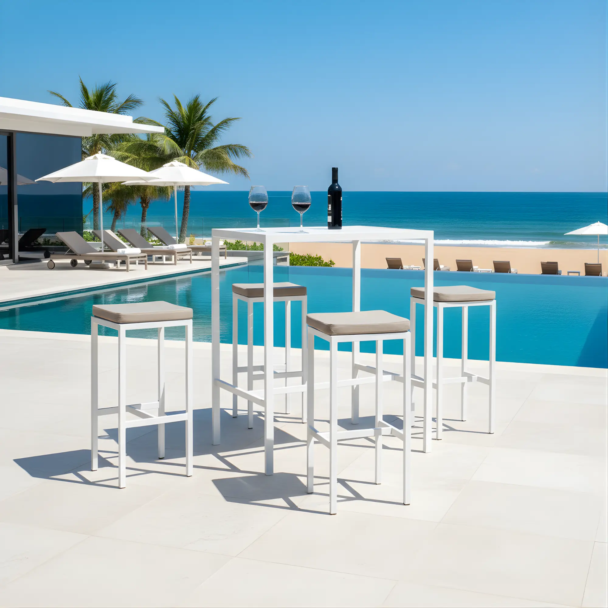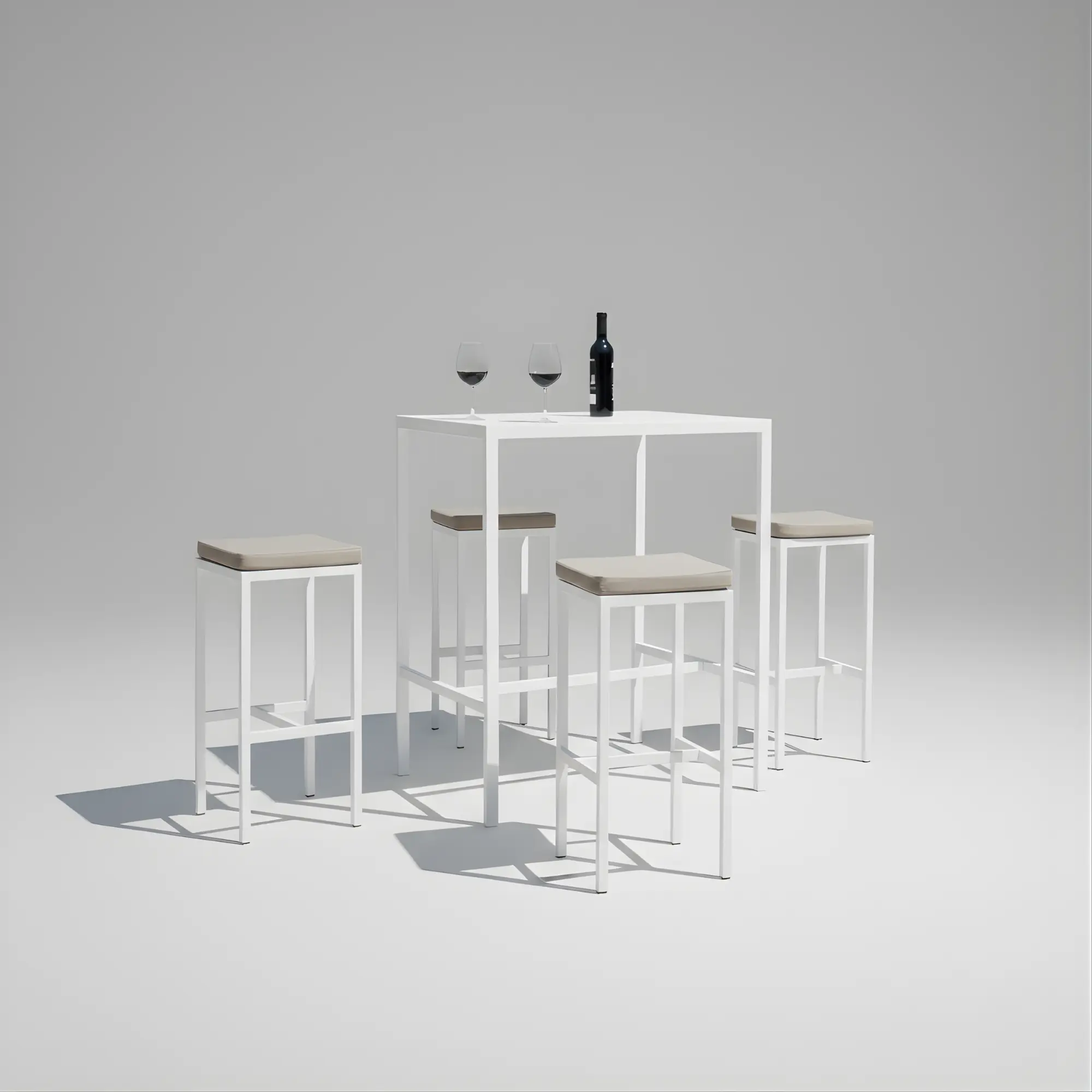 The CAELI-100 high bar table redefines outdoor elegance and functionality with its contemporary design and robust aluminium structure. Its aluminium slat tabletop is not only visually striking but also highly durable, withstanding harsh weather conditions and constant use.