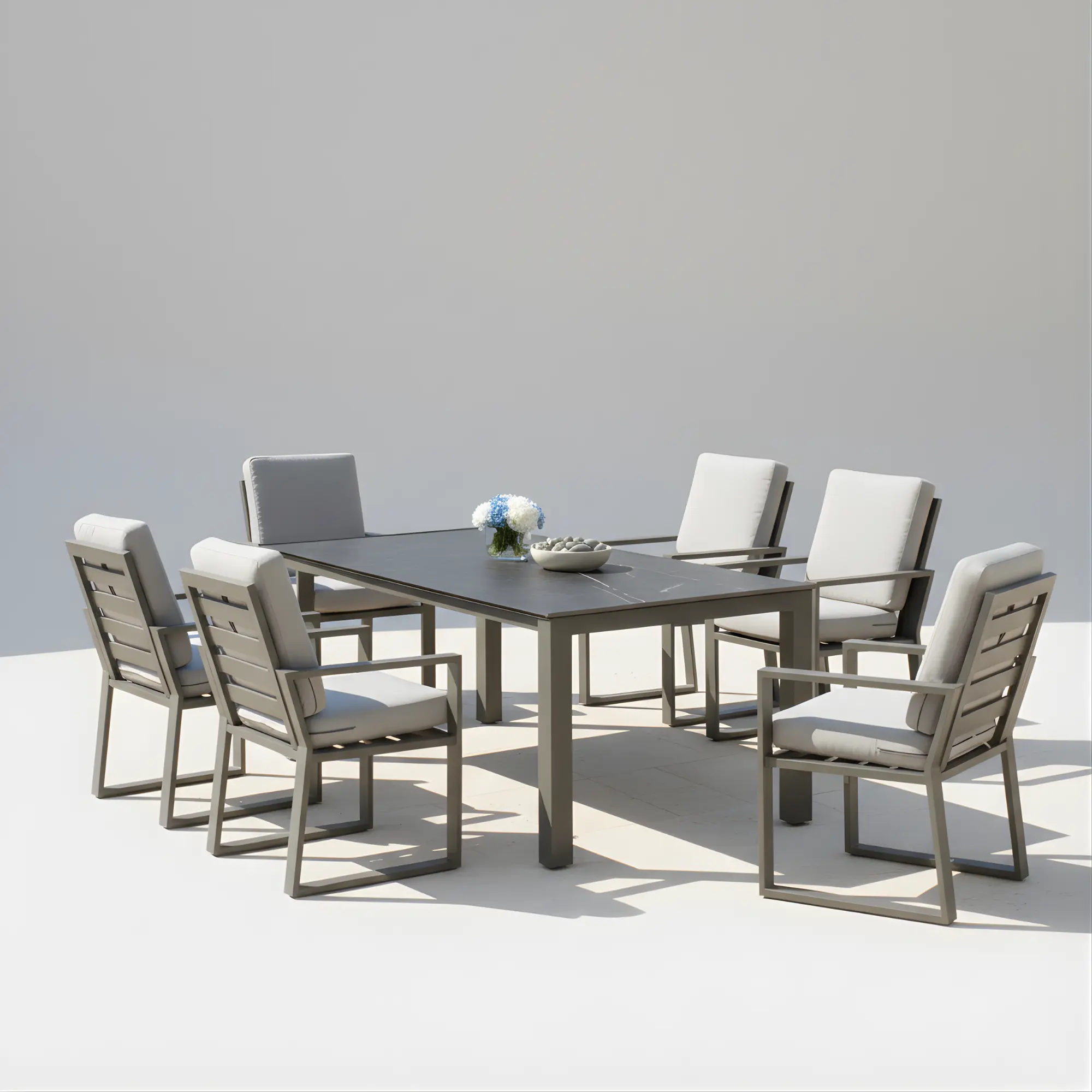 The tabletop is crafted from sintered stone, an innovative material renowned for its resistance to stains, scratches, and high temperatures. This ensures simple maintenance and exceptional durability, even when faced with demanding weather conditions. Furthermore, its elegant surface brings a modern and sophisticated touch to any setting.