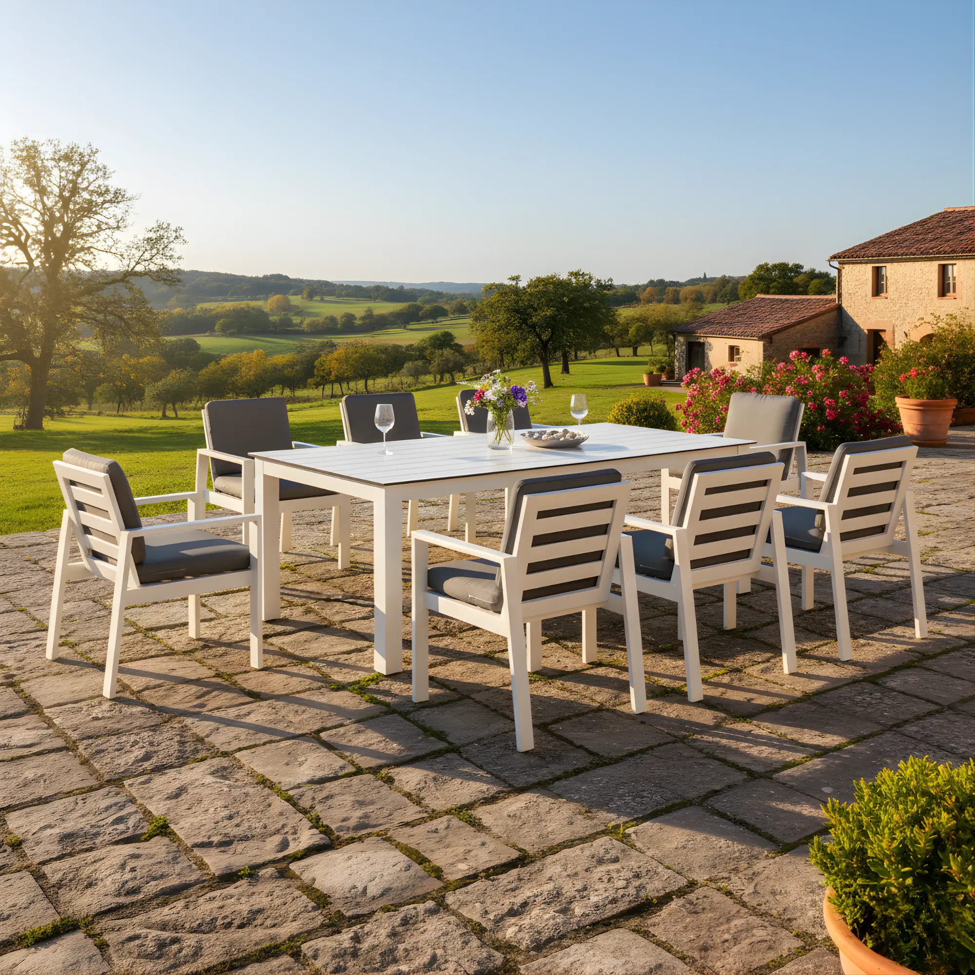 The Camelia 220 dining table stands out for its commanding presence and linear design, creating a sophisticated focal point for high-end outdoor dining areas. Built upon a chassis of high-purity, non-recycled extruded aluminium, this piece offers unwavering stability and superior corrosion resistance. Manufactured entirely at our facilities in Murcia, its 220 cm surface comfortably accommodates 8 guests, merging functionality with the durability required by both the contract and residential sectors.