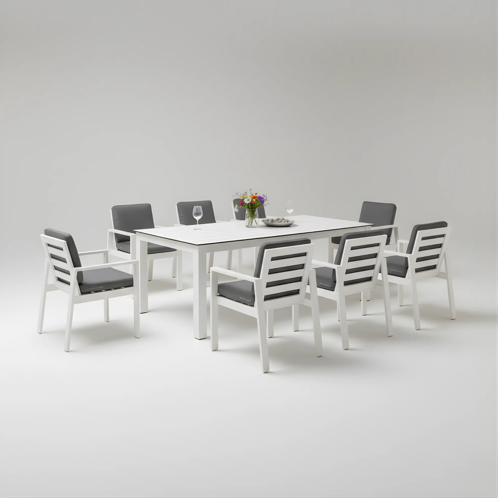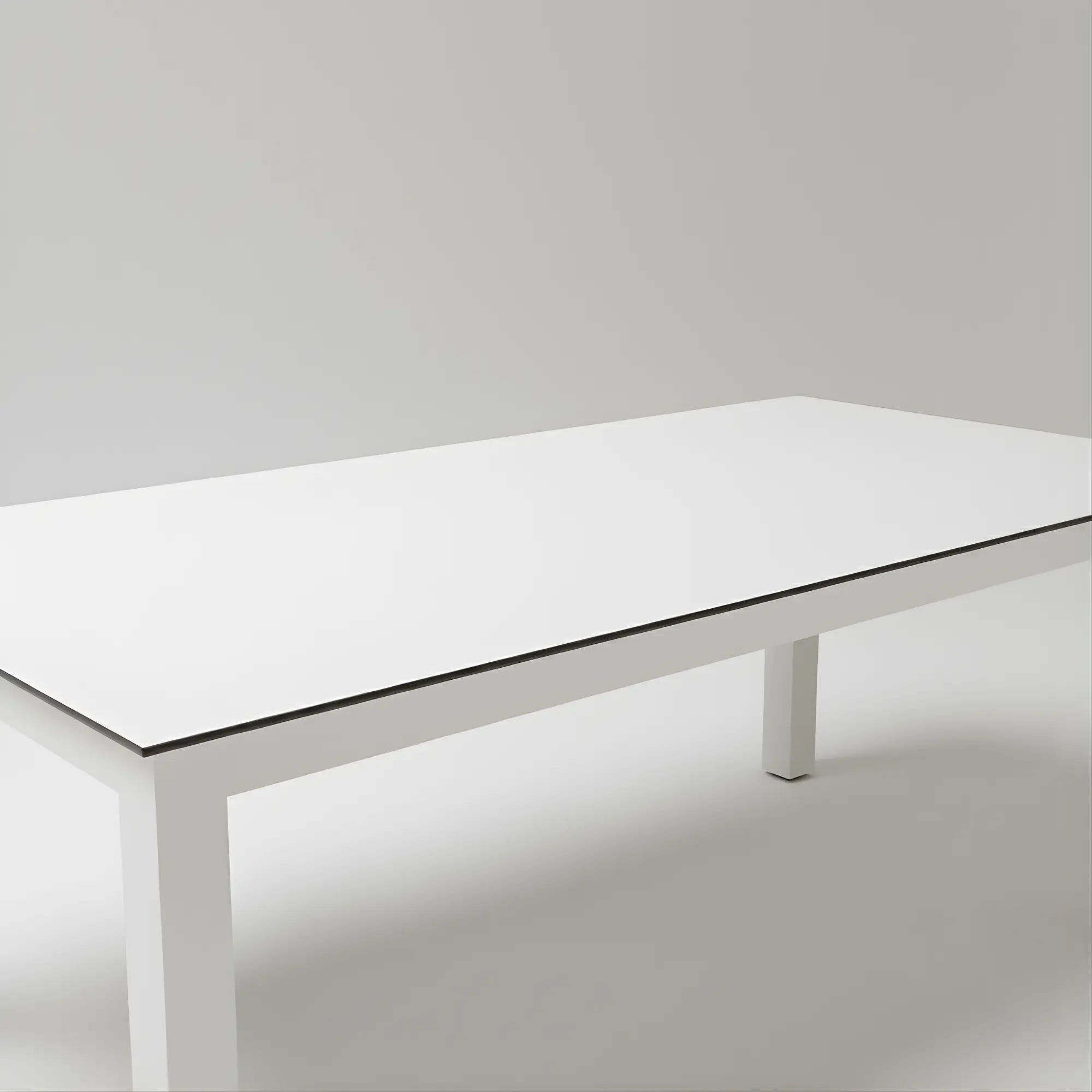 Customisation is the hallmark of the Hevea experience. You define the final character of the furniture by selecting the frame colour (White, Anthracite, Champagne, among others) and the technical tabletop material that best suits your project. Choose between the resilience of HPL and Phenolic, the purity of Krion®, or the distinction of Sintered Stone to configure a unique table capable of withstanding the harshest weather conditions.
