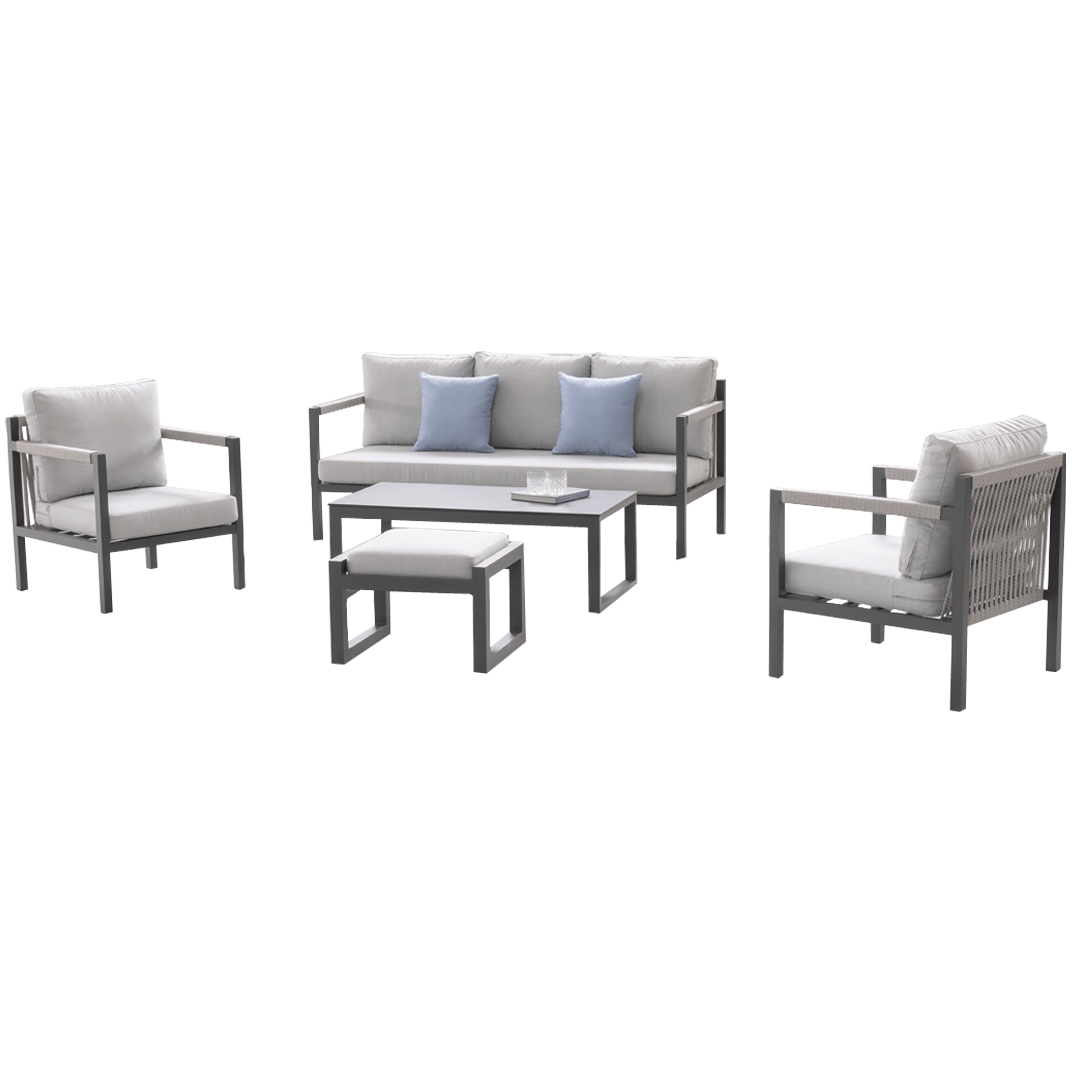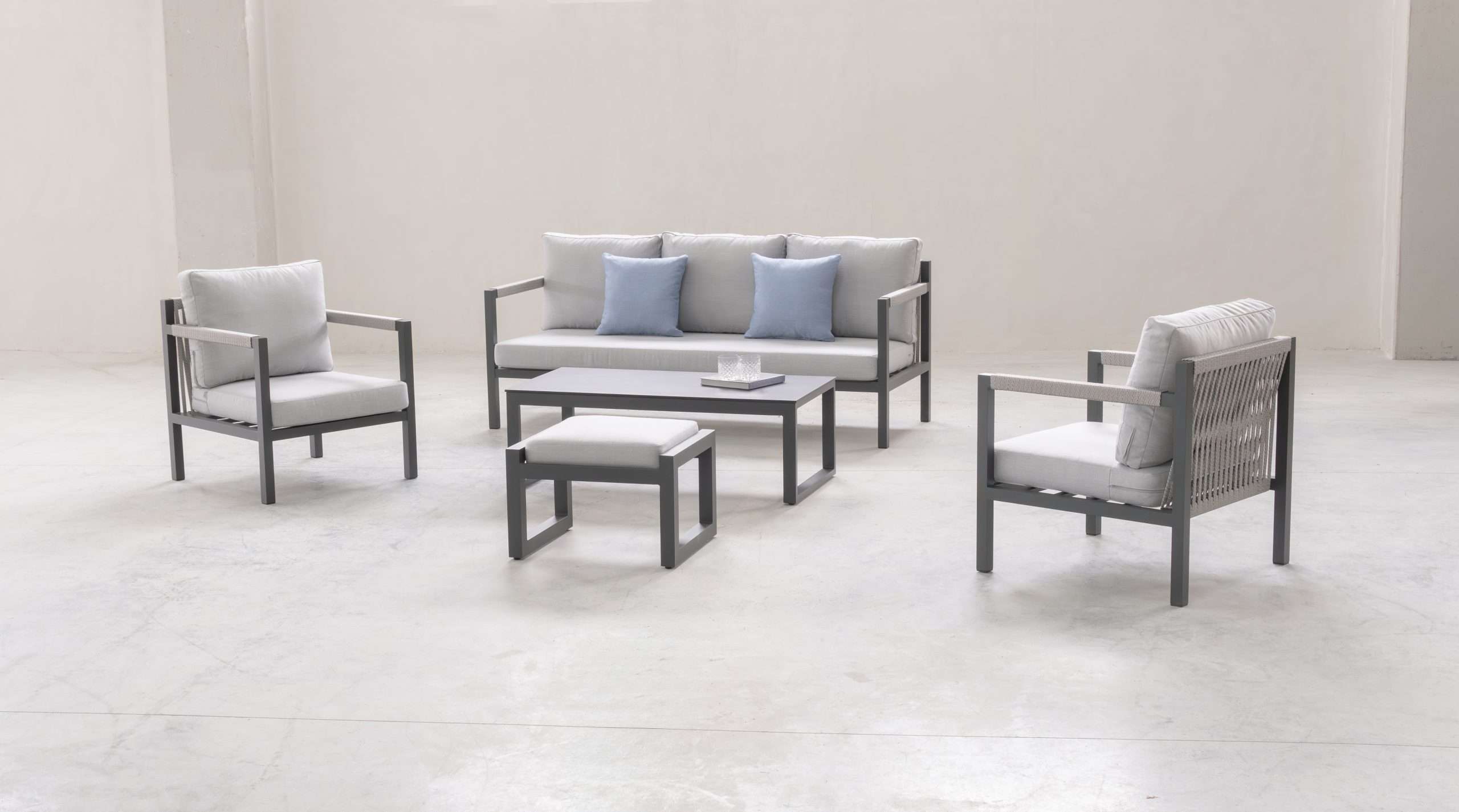The Damasco-8 5-Seater Rope Outdoor Set comprises a sofa, two armchairs, and a coffee table. Its modern design, durable materials, and padded cushions make it the perfect choice for enjoying the outdoors in total comfort.
