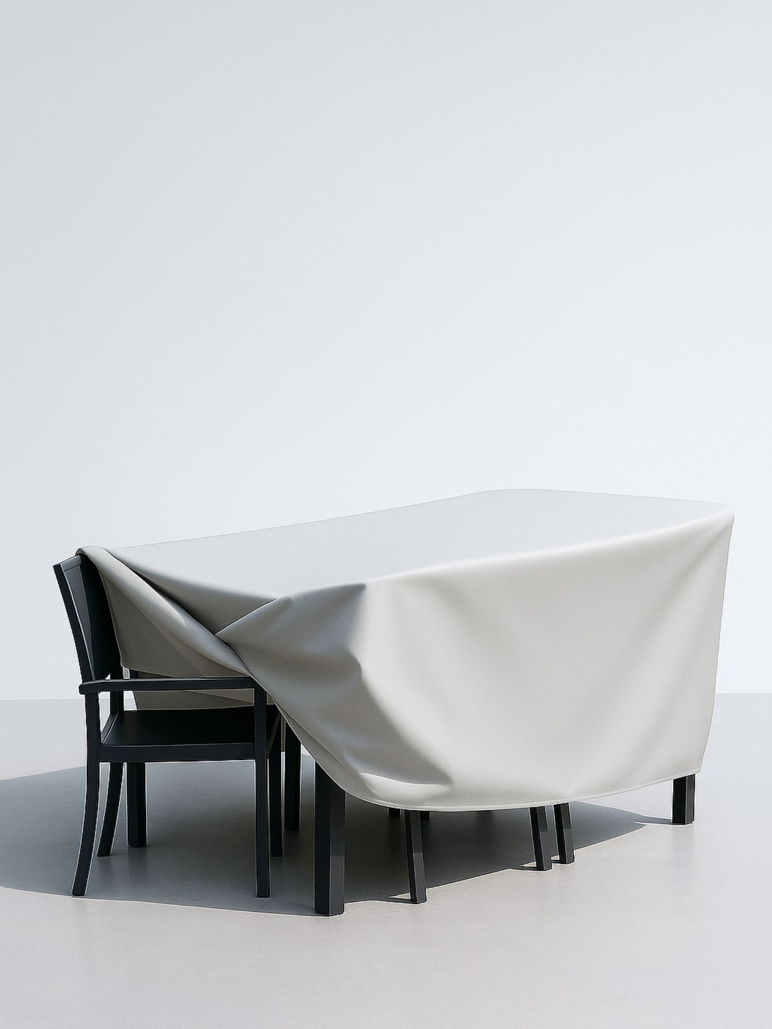 Its wide, custom design is optimized to cover a complete table set with chairs placed underneath, facilitating protection in a single step.