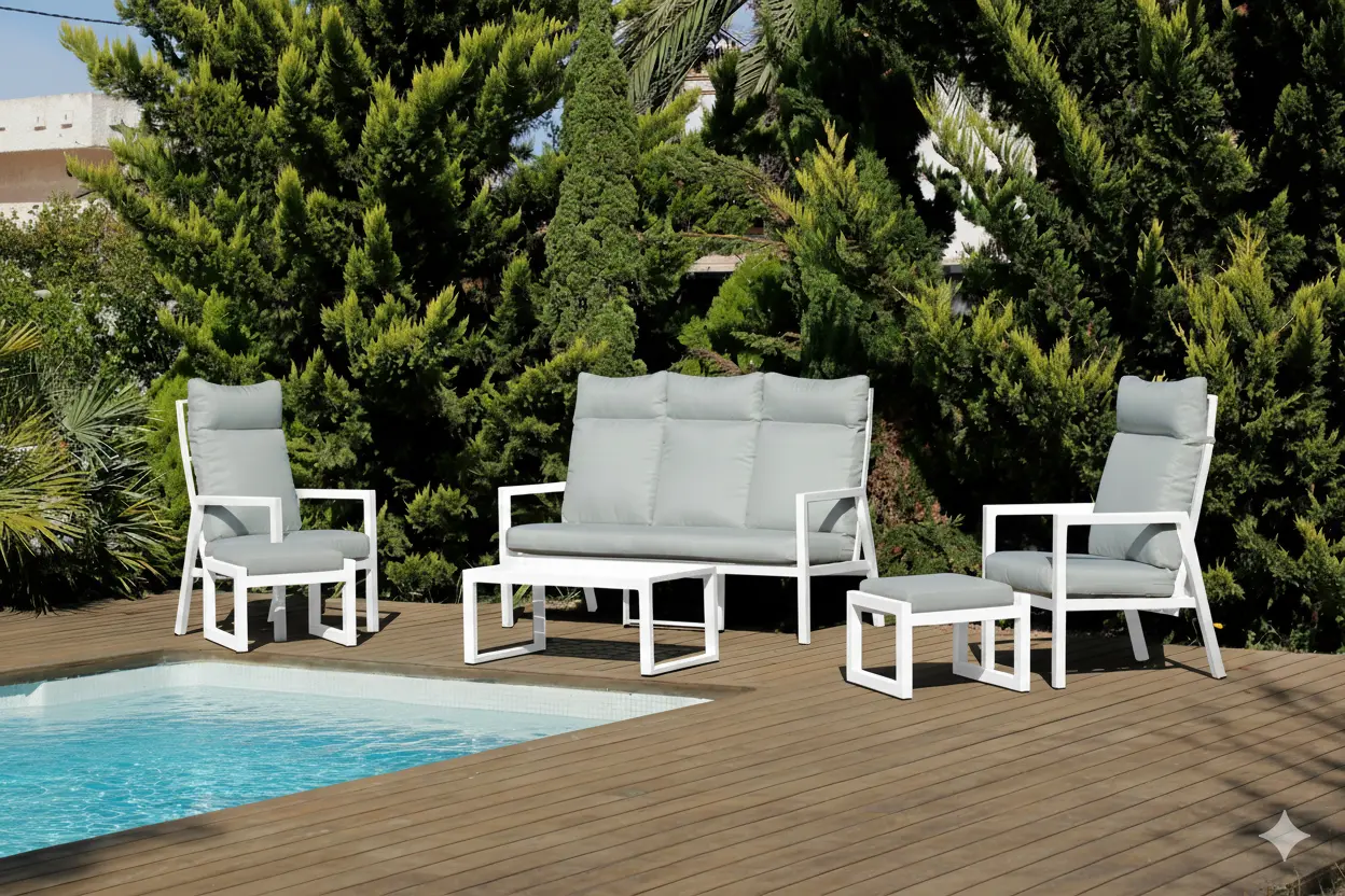 The Haston-10 Patio Sofa Set has been designed to create a complete, comfortable, and well-organised outdoor space. Its configuration includes spacious sofas, footstools, and a table, allowing you to enjoy both relaxation and outdoor social moments. The resistant structure guarantees stability and prolonged outdoor use, while its balanced design easily fits into large terraces and patios. This set offers a comfortable experience thanks to its carefully planned distribution, intended for daily use. The Haston-10 is ideal for those seeking a functional, durable, and aesthetic solution capable of adapting to different lifestyles and outdoor needs.