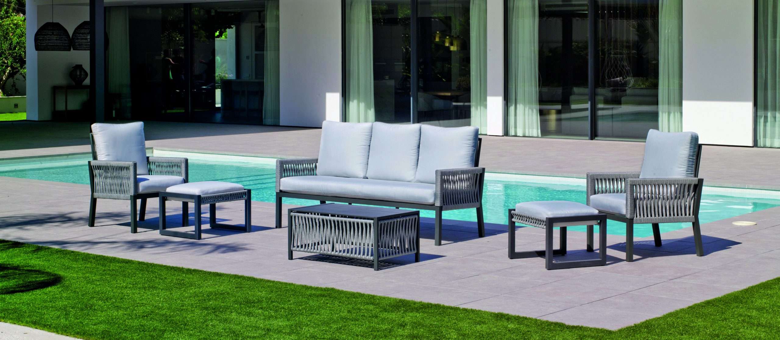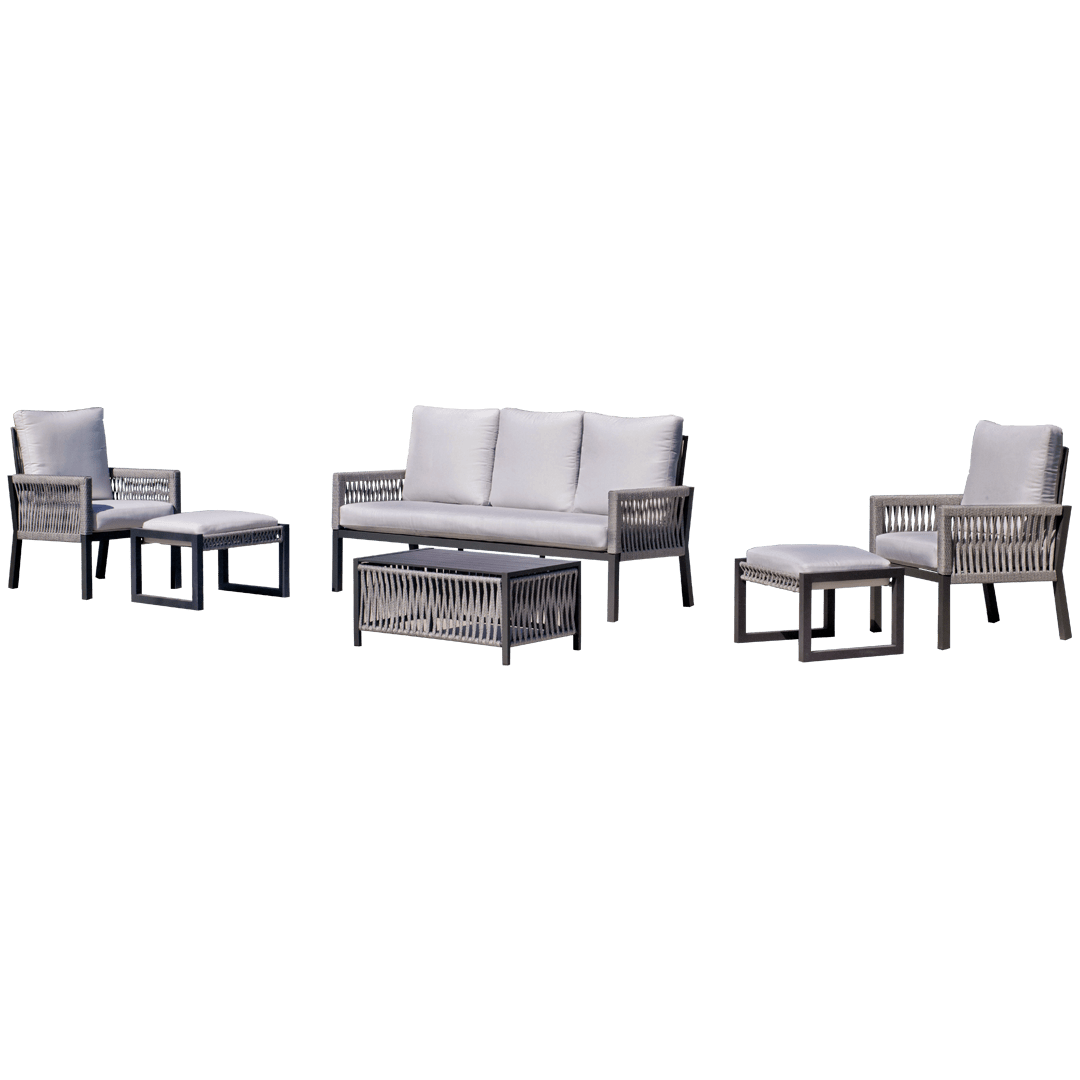 The Havana-8 Aluminium Garden Furniture Set is the perfect choice for those seeking a balance between contemporary design, resistance, and outdoor comfort. Featuring an aluminium structure that offers lightness and durability, and a nautical rope weave that adds sophistication and high resistance to climatic conditions, this set perfectly adapts to any exterior space. It includes a large three-seater sofa, two individual armchairs, and a coffee table with a tempered glass top, creating the ideal setting to enjoy terraces, gardens, or patios. The padded cushions provide exceptional comfort, allowing you to relax and share pleasant moments with style.