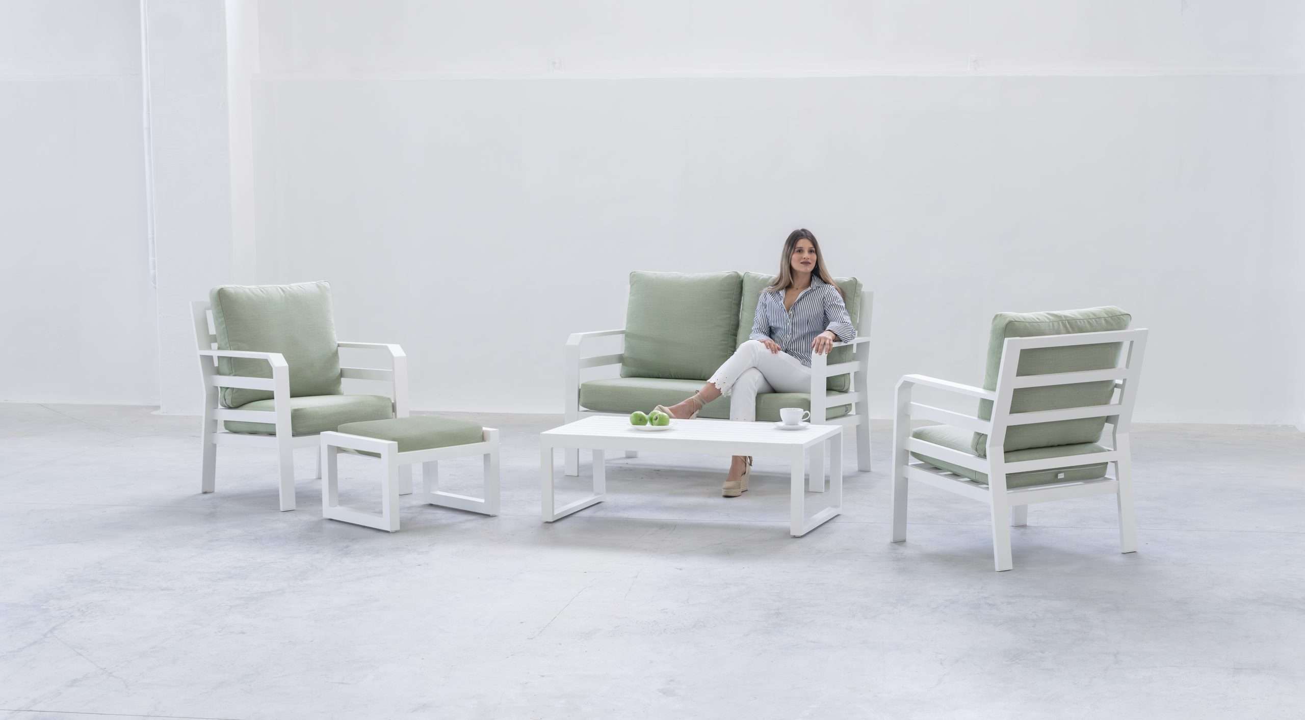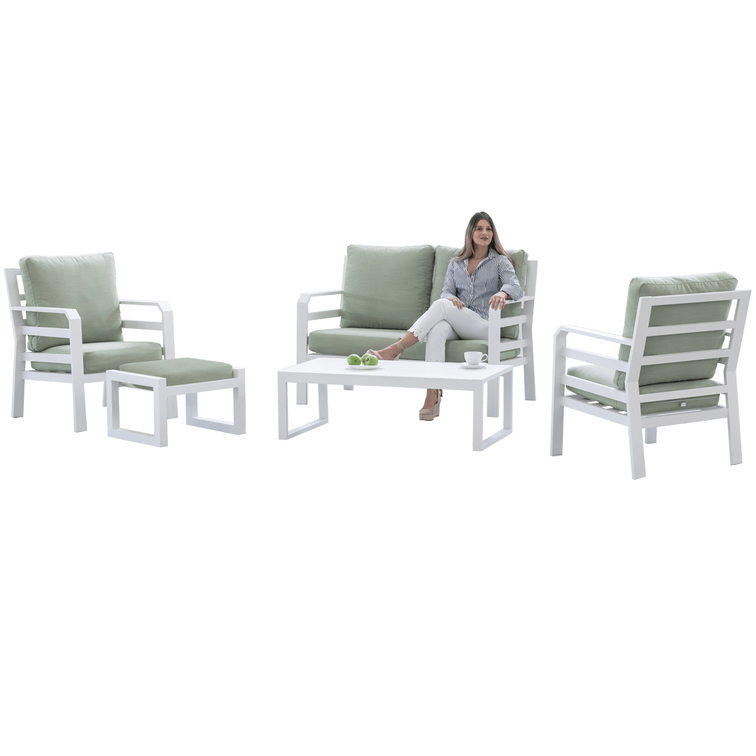 The Kravi-7 Terrace Aluminium Set is the perfect choice for those seeking an elegant, comfortable and functional outdoor set. This set includes a 2-seater sofa, two single armchairs and a coffee table, all with a robust and durable aluminium frame that guarantees a long lifespan. The cushions provide an appropriate level of comfort for enjoying the outdoors, while the modern and minimalist design ensures the set fits perfectly on any terrace, garden or patio.