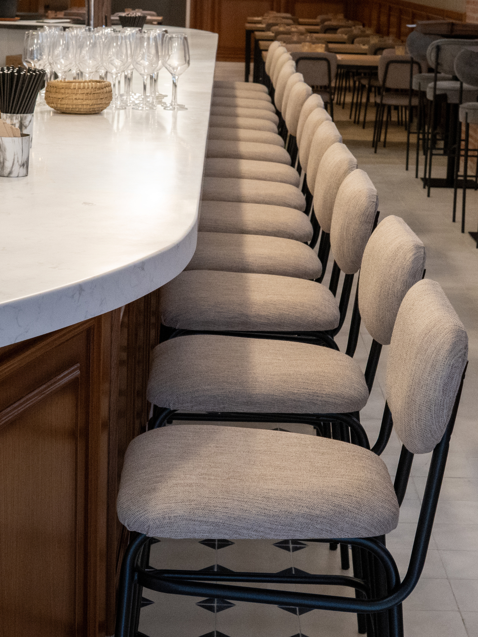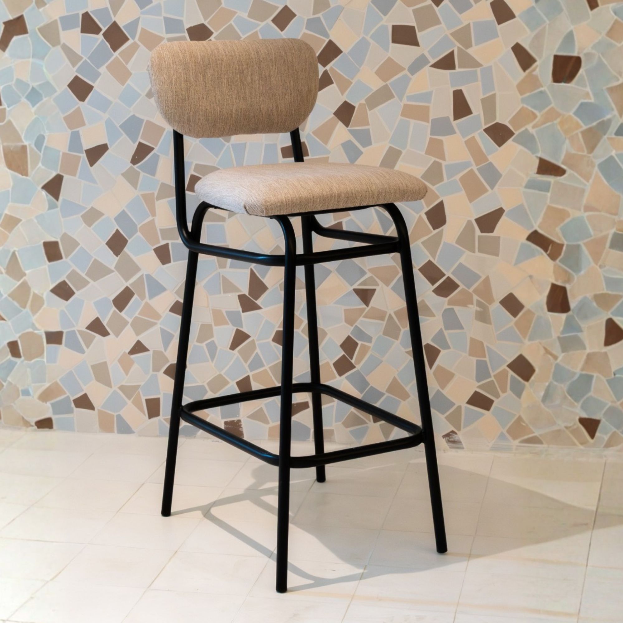 Bar stool with an aluminium frame. Manufactured in Spain using high-quality materials. Upholstery is customisable in over 50 fabric colours. A modern, durable piece, perfect for terraces, bars, restaurants, and outdoor spaces. The ideal combination of design, comfort, and longevity.