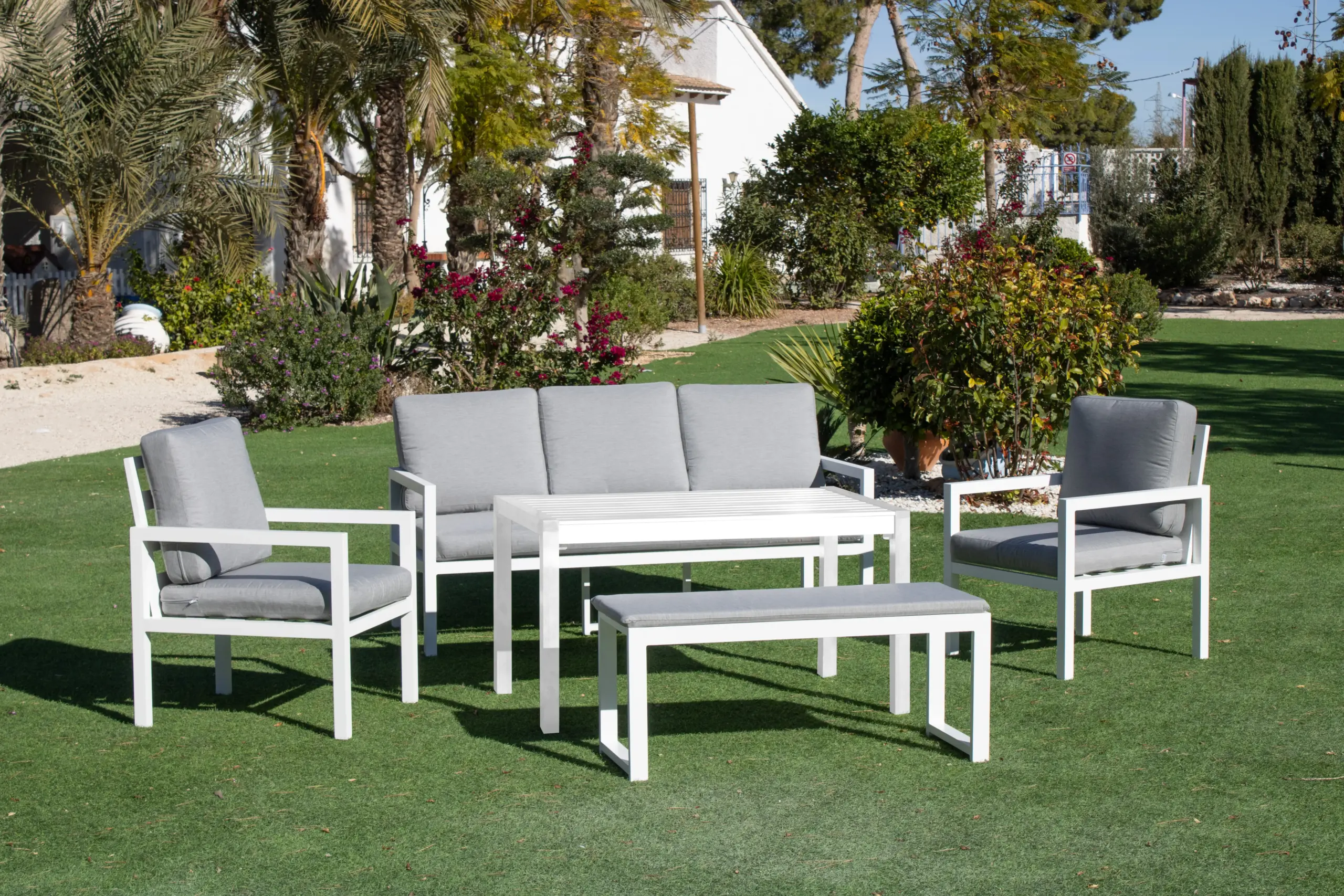 Mandalay-15 Outdoor Set manufactured in Spain with a 3-seater sofa, two armchairs, an auxiliary bench and a high coffee table. Ideal for informal dining.