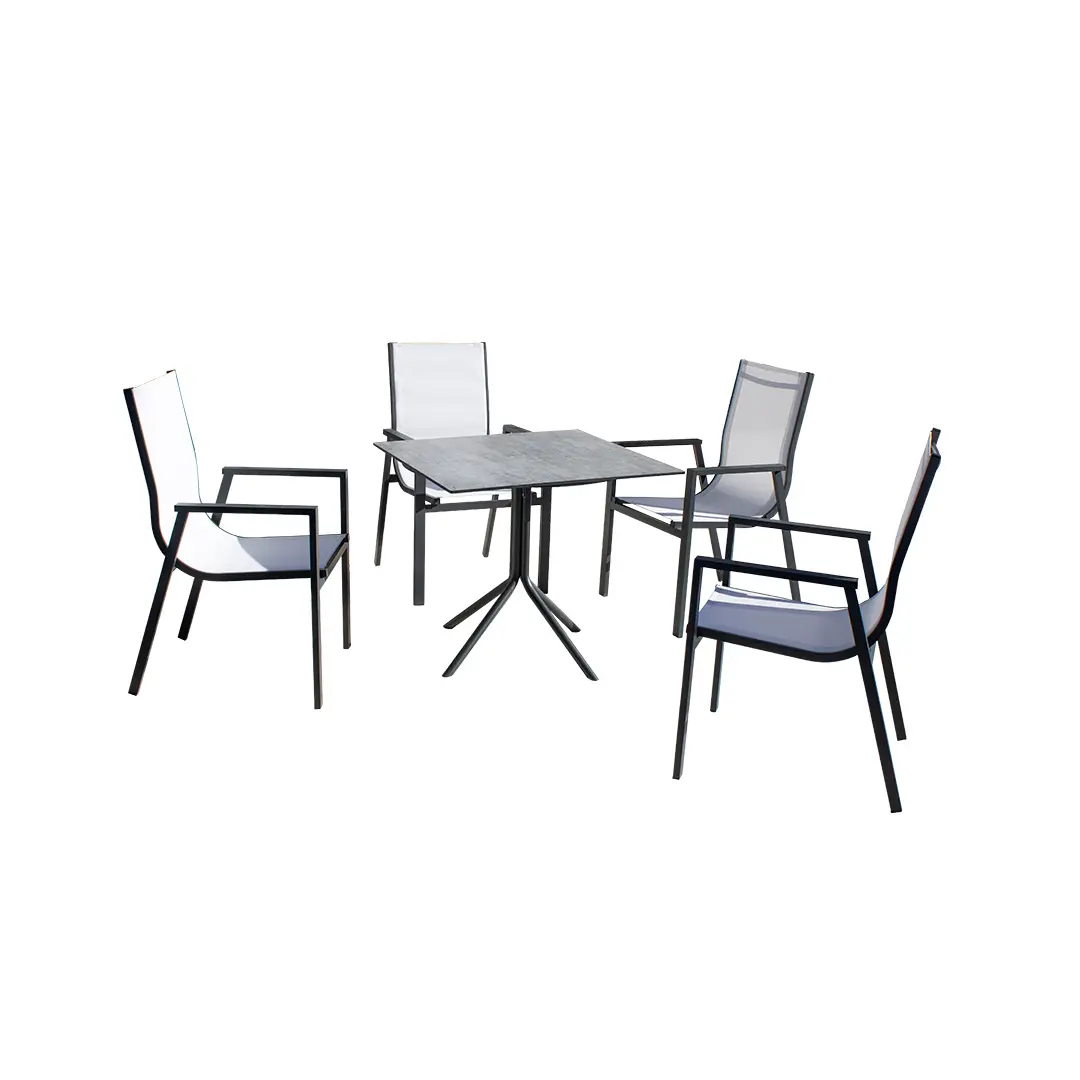 The MISTRAL table and 4 SIDNEY chairs set offers both functionality and style, creating a welcoming and sophisticated atmosphere for hospitality terraces while maximising available space.