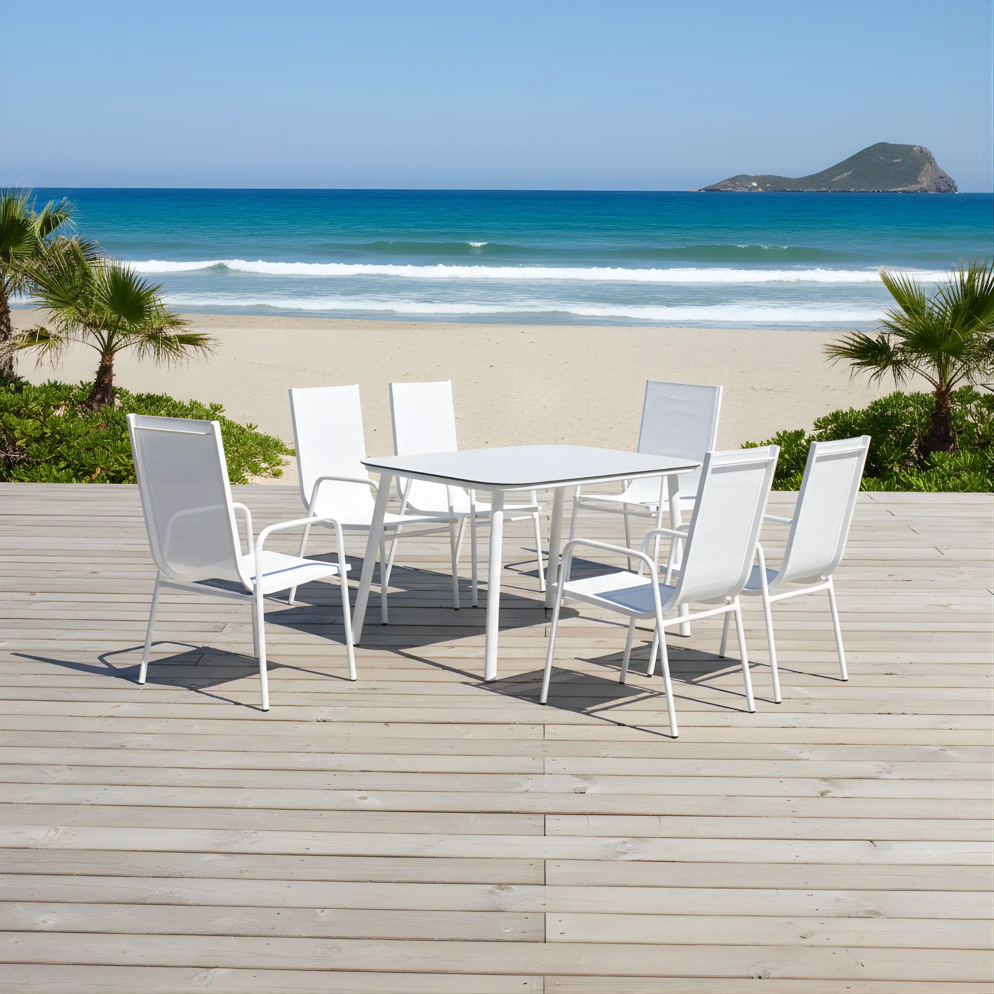 The Mundra 150 table is a 150×90 cm rectangular table, perfect for outdoor gatherings and meals. Its aluminum structure guarantees weather resistance, while its modern design provides elegance and functionality. Ideal for accommodating up to 6 people in gardens, terraces, or patios.