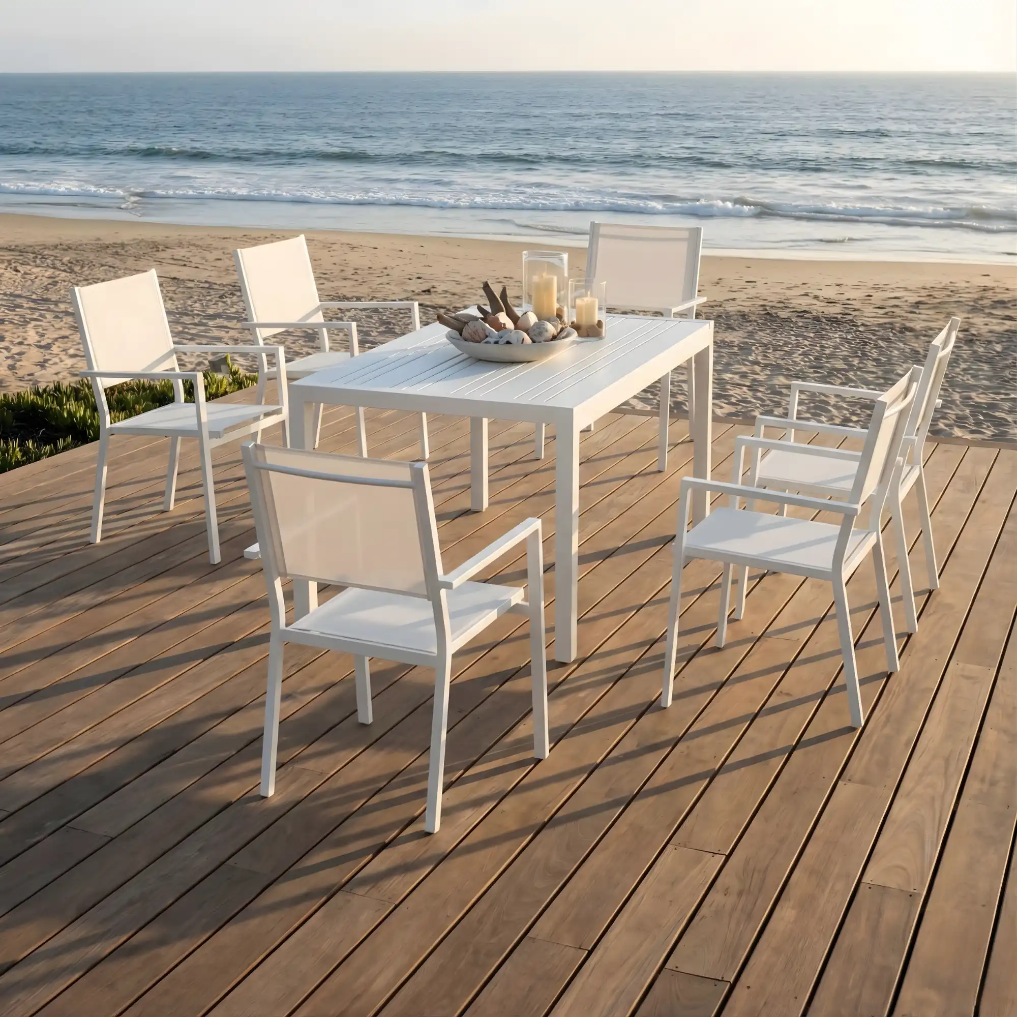 The Naloa 150×90 table offers style and functionality for small gatherings. Its aluminium frame is light and durable, ideal for outdoors, and its six customisable colours allow it to easily match any decor.