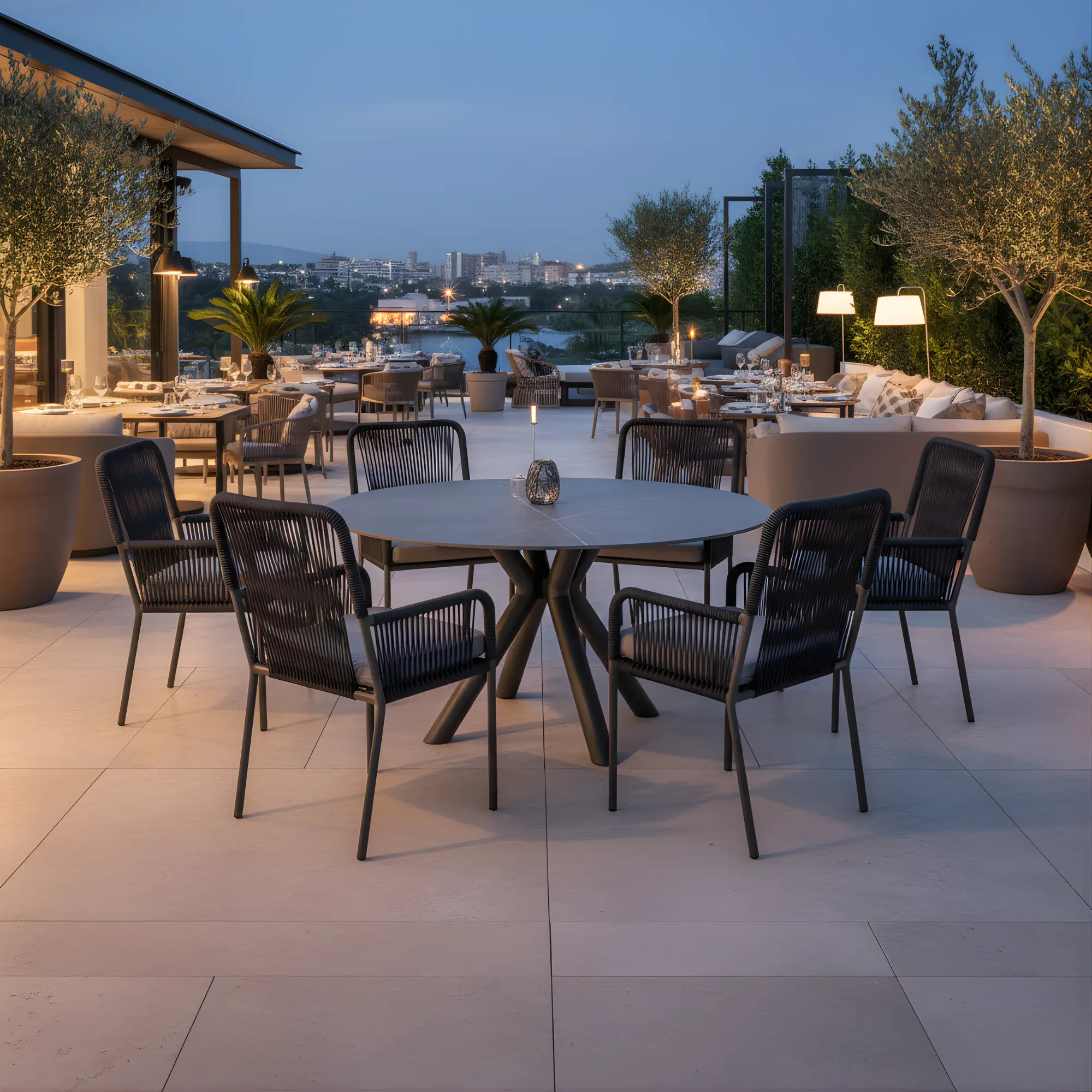 The Palawan 120 table combines elegance and functionality in a compact format, ideal for small terraces, balconies, and gardens. Its natural stone tabletop offers high weather resistance, while the structure with Qualicoat paint guarantees durability and protection against corrosion. Perfect for outdoors with style.