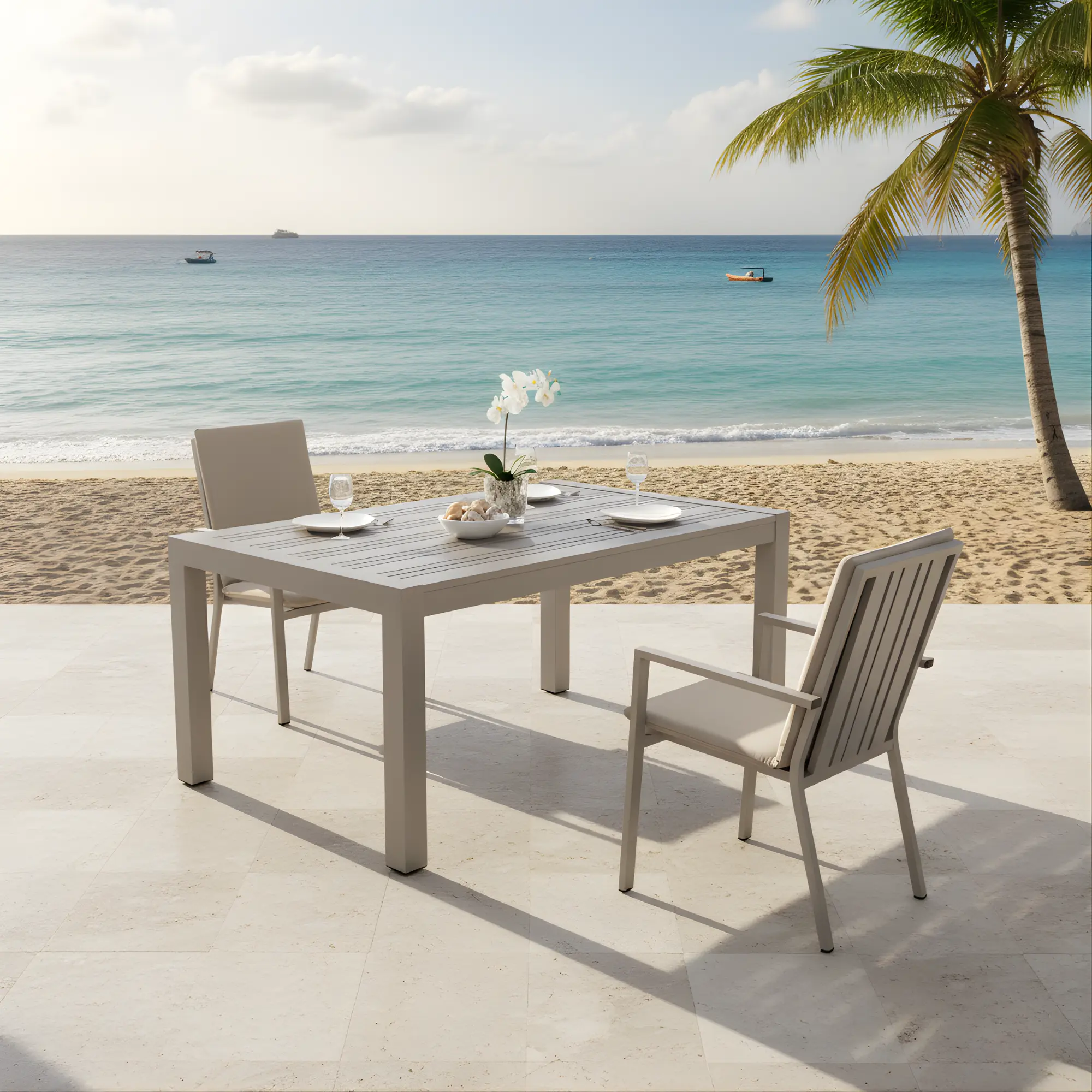 The Paola 180 table is distinguished by its high-quality all-aluminium design, offering a solid and contemporary aesthetic ideal for demanding outdoor spaces. Its aluminium slatted surface not only provides a distinctive visual character but also ensures superior durability against corrosion and intensive use. Manufactured 100% at our Murcia facilities from pure, non-recycled extruded aluminium, this piece ensures unwavering structural stability, eliminating imperfections through expert polishing for optimal paint adhesion.