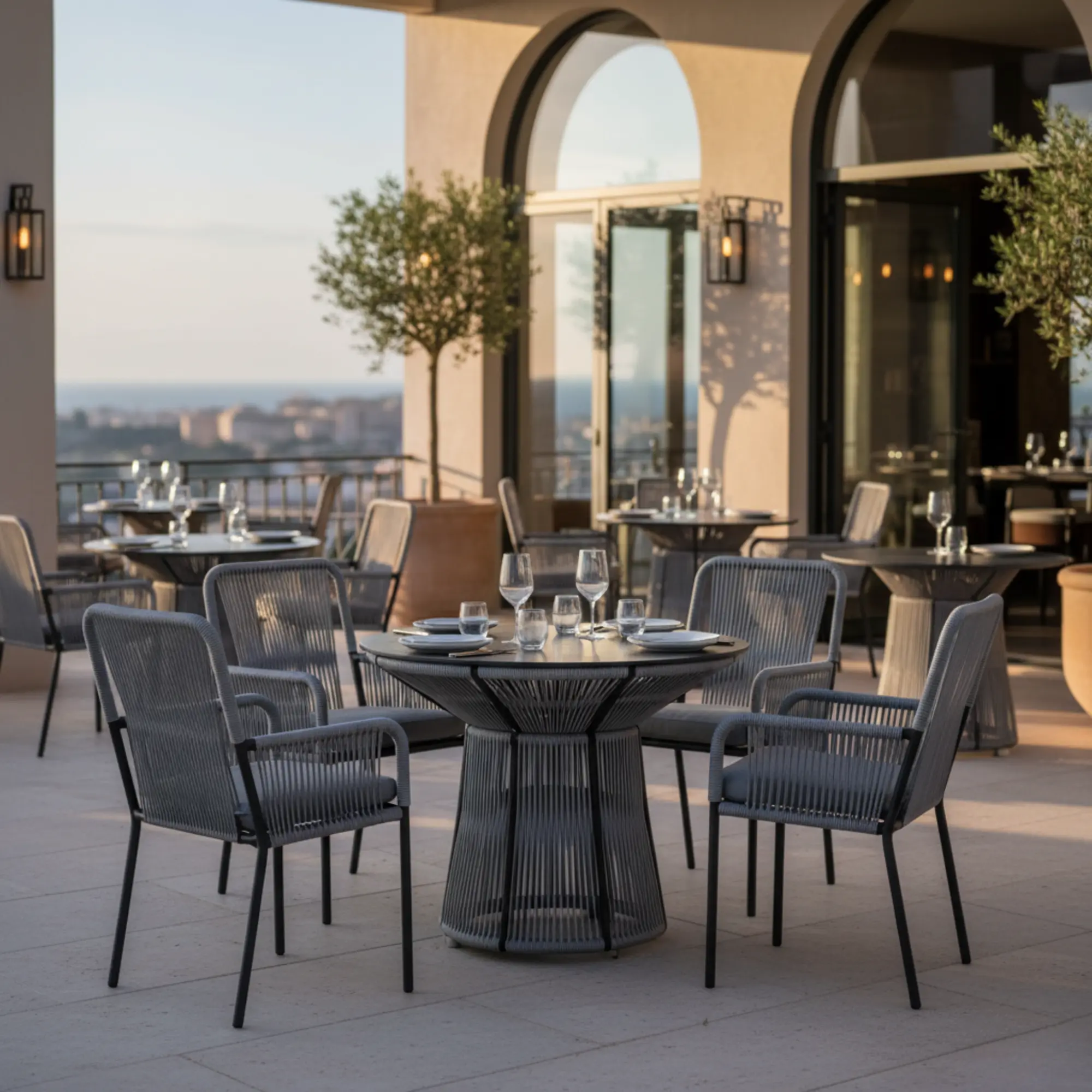 The Rodhos 91 table stands out for its refined design and exceptional durability. Featuring an aluminium frame and braided cord details, its HPL tabletop is resistant to humidity, heat, and UV rays. Ideal for small spaces, it is perfect for terraces and gardens.