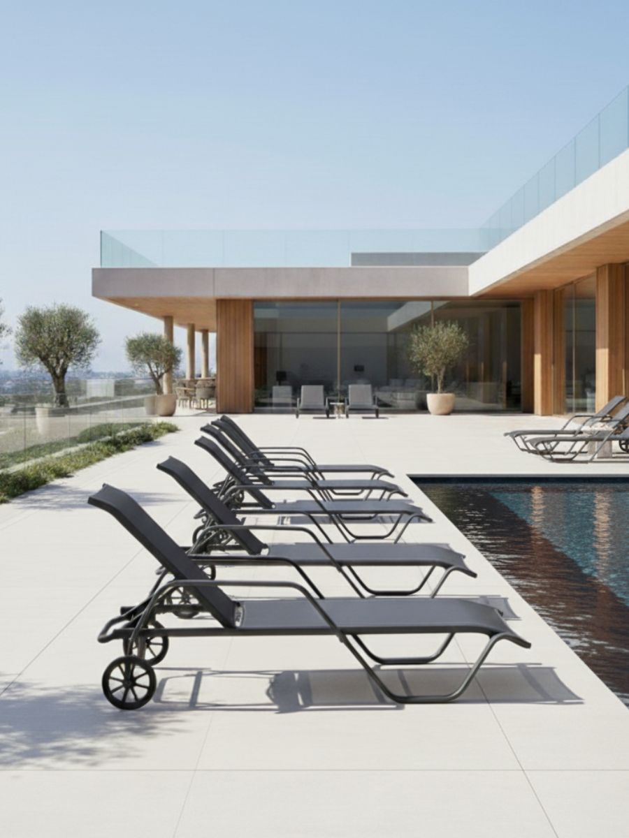 Set of 10 MARINA hospitality sun loungers featuring an aluminium frame and Textilene fabric, ideal for outdoor spaces.