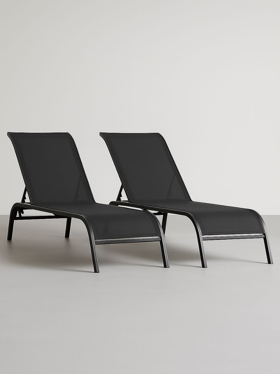 The Set of 2 BRESCIA sun loungers, specifically designed for a seated lounging position, are manufactured from aluminium and Textilene and feature a reclining backrest. Ideal for any outdoor space, they offer both comfort and durability.
