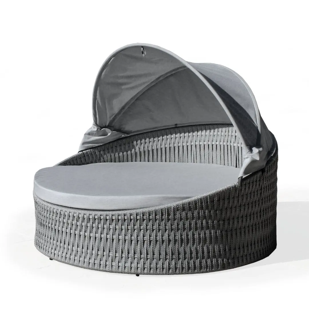 The Tenerife round Balinese bed, with its elaborate hand-braided nautical rope, is ideal for hotels, pools, terraces, and gardens. Featuring a retractable canopy and specialized cushions, it offers an elegant and cozy retreat for relaxing outdoors in style.