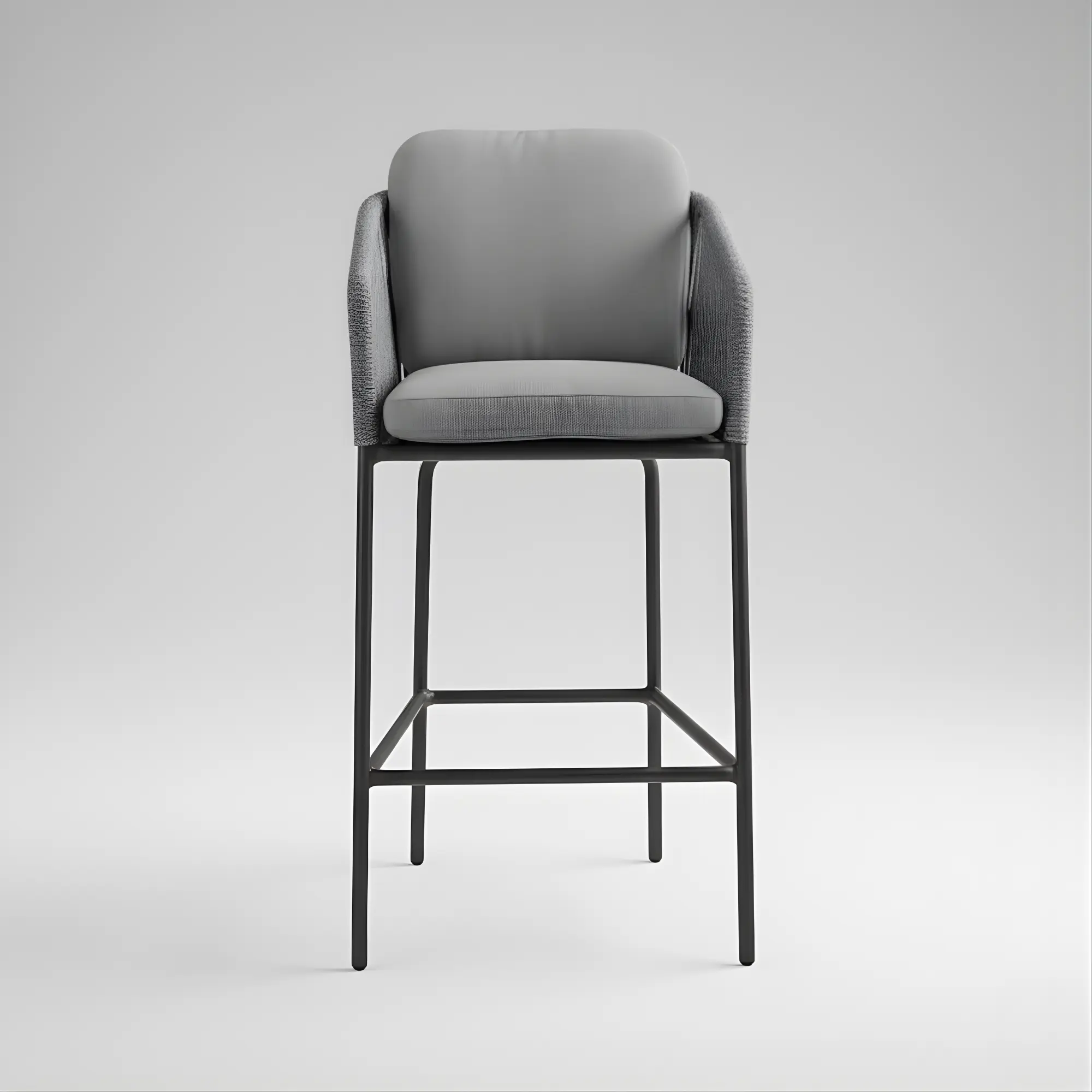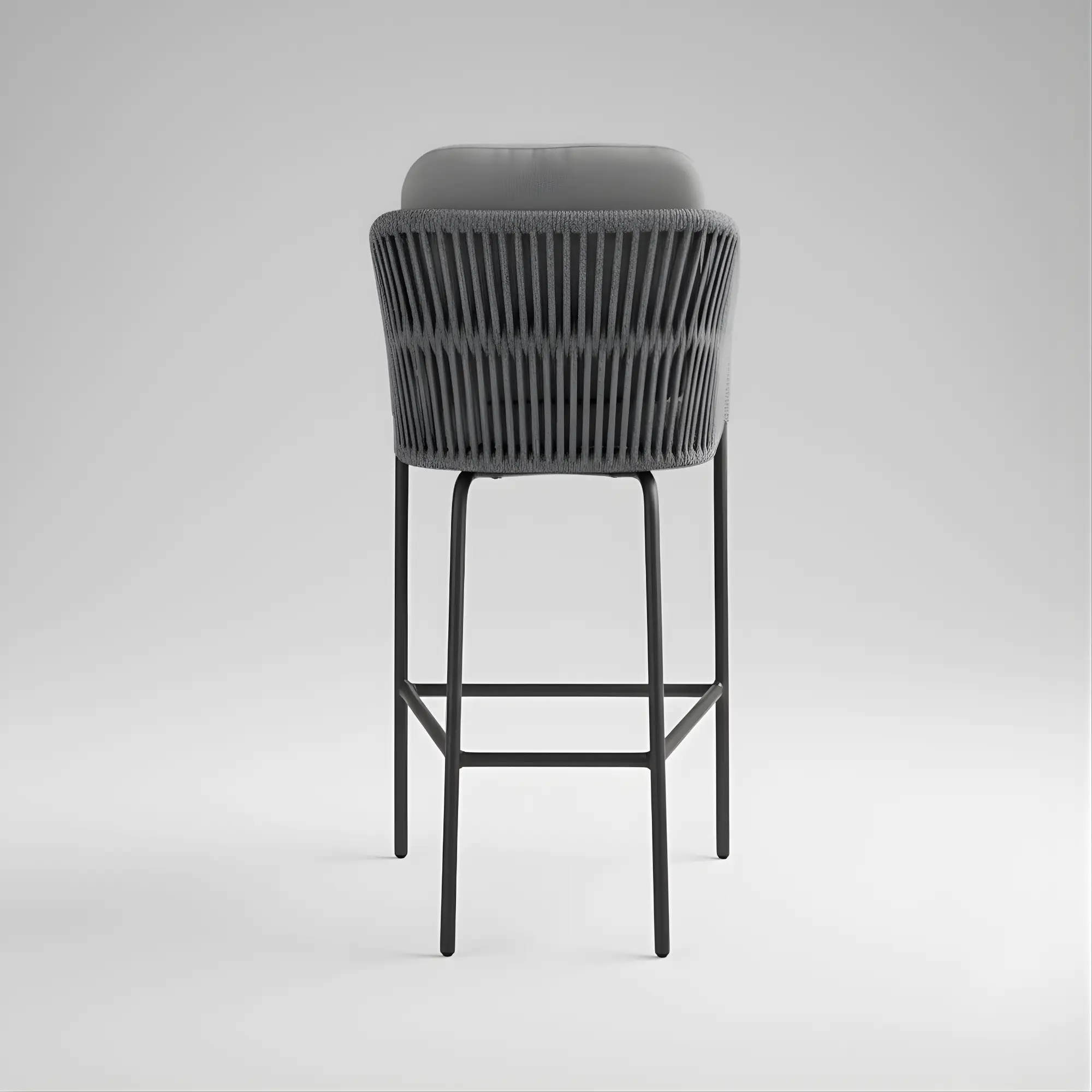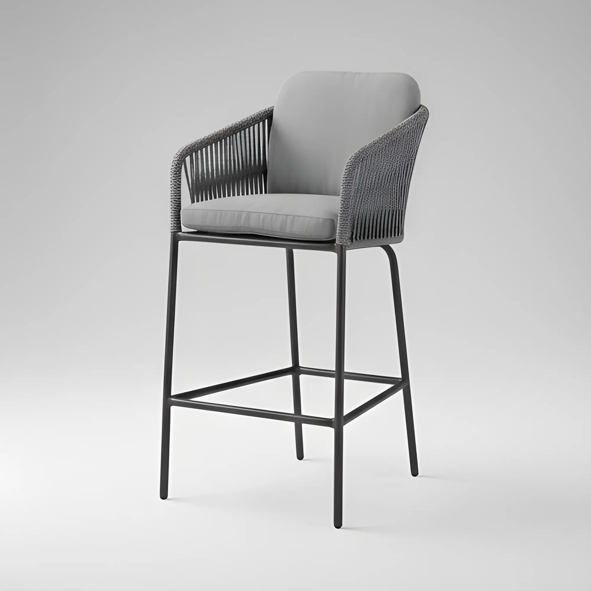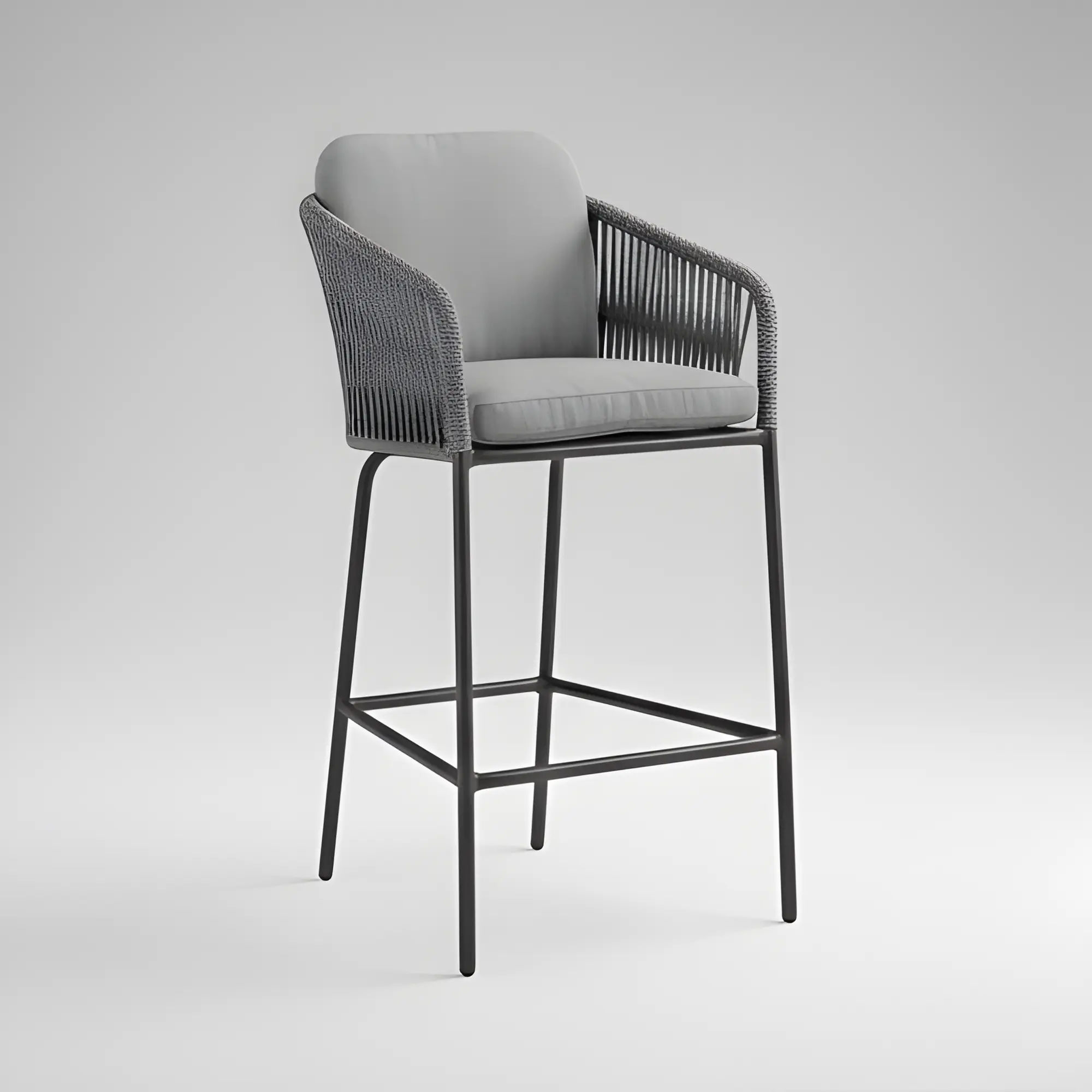 The Tulip-5 high bar stool with rope offers modern design and comfort. With an aluminium frame and braided rope seat, it is ideal for bars and terraces, durable, and easy to maintain.