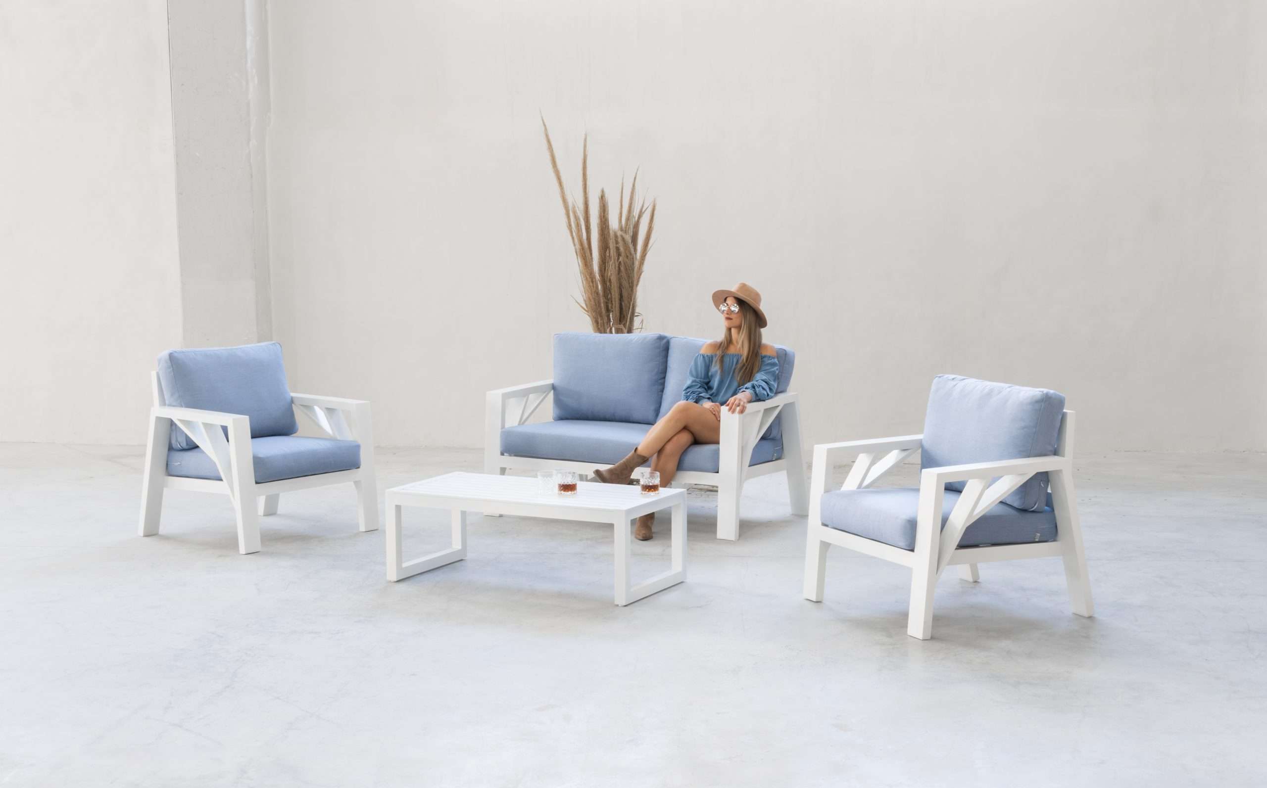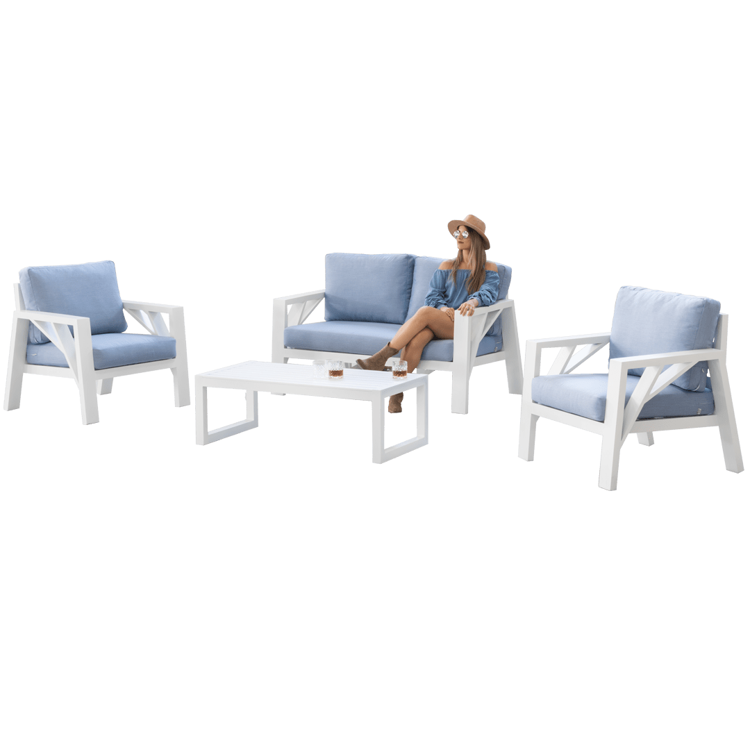 This aluminium sofa set includes: a 2-seater outdoor sofa with two individual armchairs and a table, ideal for small or medium-sized spaces. Product manufactured in Spain.