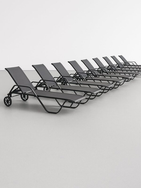 Set of 10 MARINA hospitality sun loungers featuring an aluminium frame and Textilene fabric, ideal for outdoor spaces.