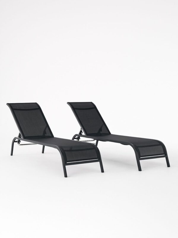 Set of 2 LEOPAR sun loungers, manufactured from aluminium and Textilene. This set offers comfort and elegance for any outdoor space. These models feature a modern design, are stackable, and include a 5-position reclining backrest.