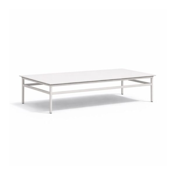 Rectangular VADARA 120 cm coffee table, characterised by its reinforced aluminium structure and stylised legs. Expertly crafted in Spain, it offers a spacious, lightweight surface—ideal for completing garden sets with a modern touch and total corrosion resistance.