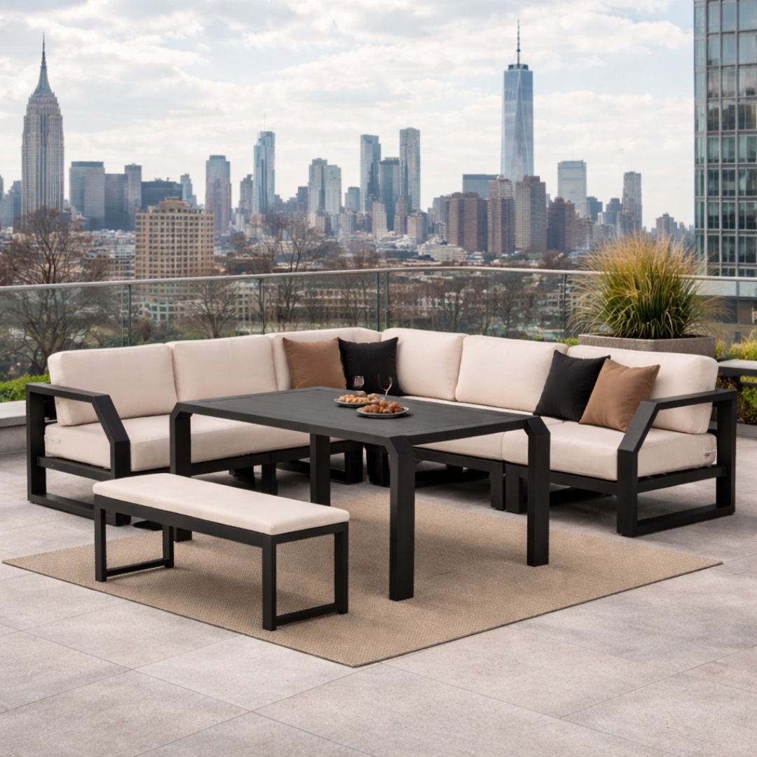Large-format modular corner set crafted from high-resistance aluminium. Includes several independent modules, allowing you to adapt the layout to your available space. Designed for spacious outdoor areas, it offers generous seating capacity, structural stability, and a modern aesthetic perfect for gardens and terraces.